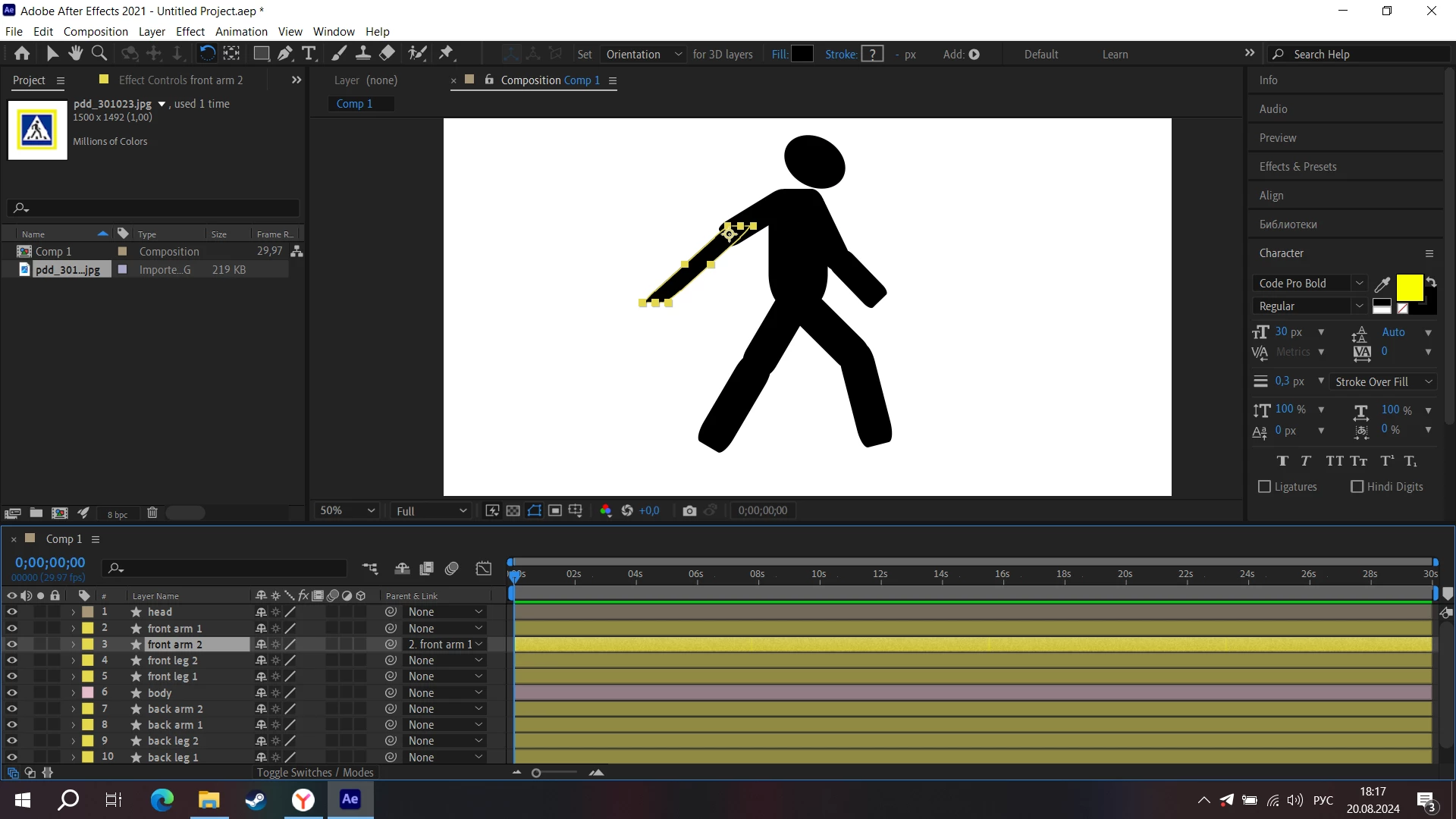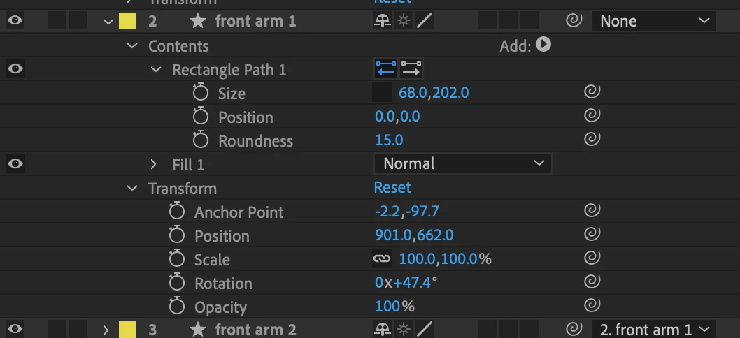 Hi, I'm new and I wanted to link 2 shape layers together. I wanted to make an animation of a little man. But when I connect one part of my arm with the second, this part of my arm deforms and rotates as if in a different projection. What to do?