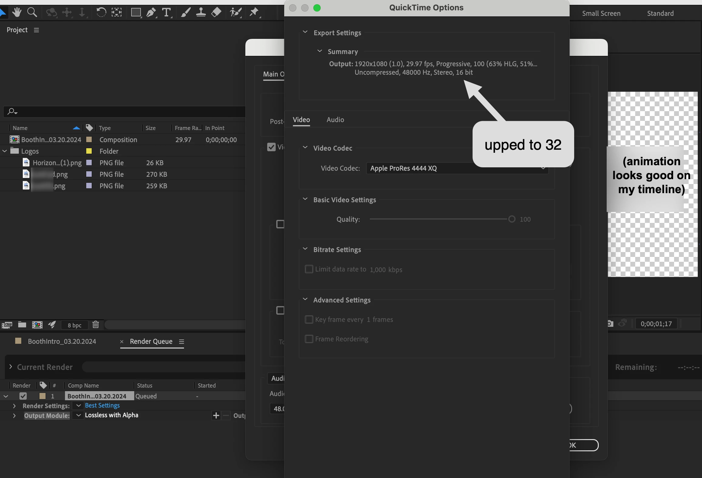 *Additionally, I've tried changing the Video Output Color from Preformatted to Straight (unmatted) and upping the output bit rate to 32, neither producing a better outcome.