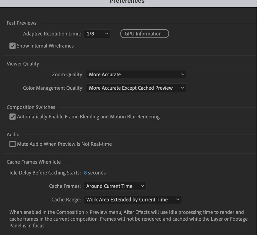 In the Preview panel I have tried checking and unchecking both “If caching, play cached frames” and “Move time to preview time”