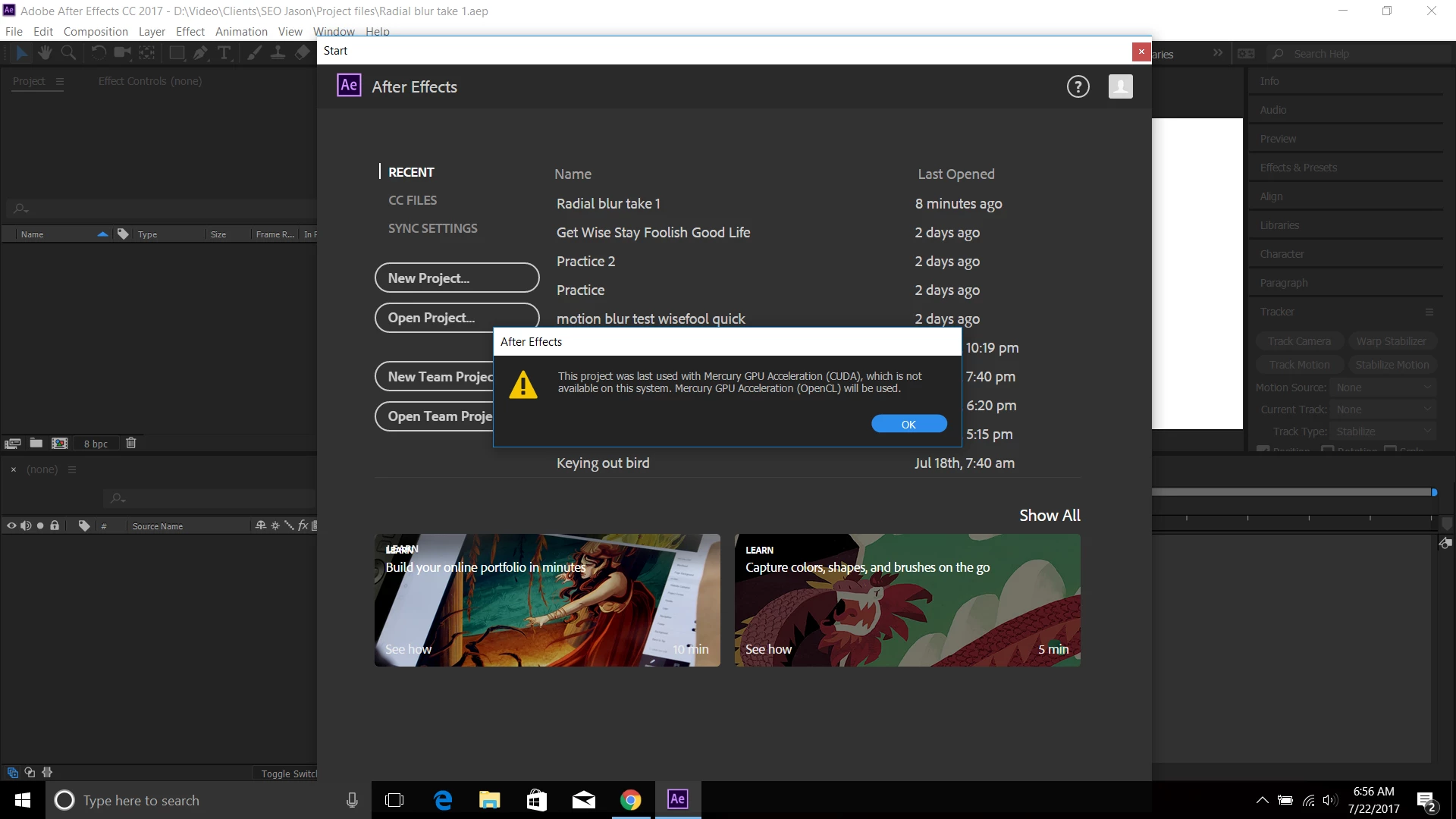 I was using it when it came perfectly for about 5 days and was blown away at how it was preforming. Then I updated the video drivers to the latest version. I was using CUDA gpu acceleration before the update. Now the only option is opencL for both after effects and premiere. Also every time I open after effects I get this message: