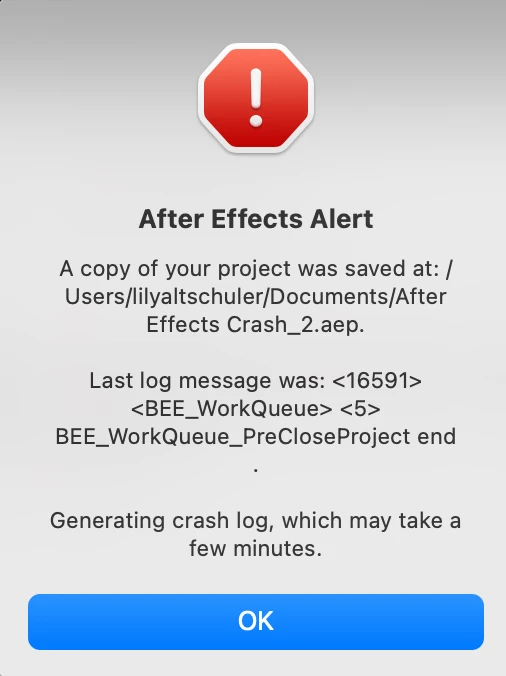 I have been trying to open an after effects project file that was working fine a few hours ago but now it does this everytime I open it and after effects closes after. I tried dragging it into a different project and restarting my mac but it still won't work. I am on after effects 2022 and cannot upgrade. Anyone know how to fix this?
