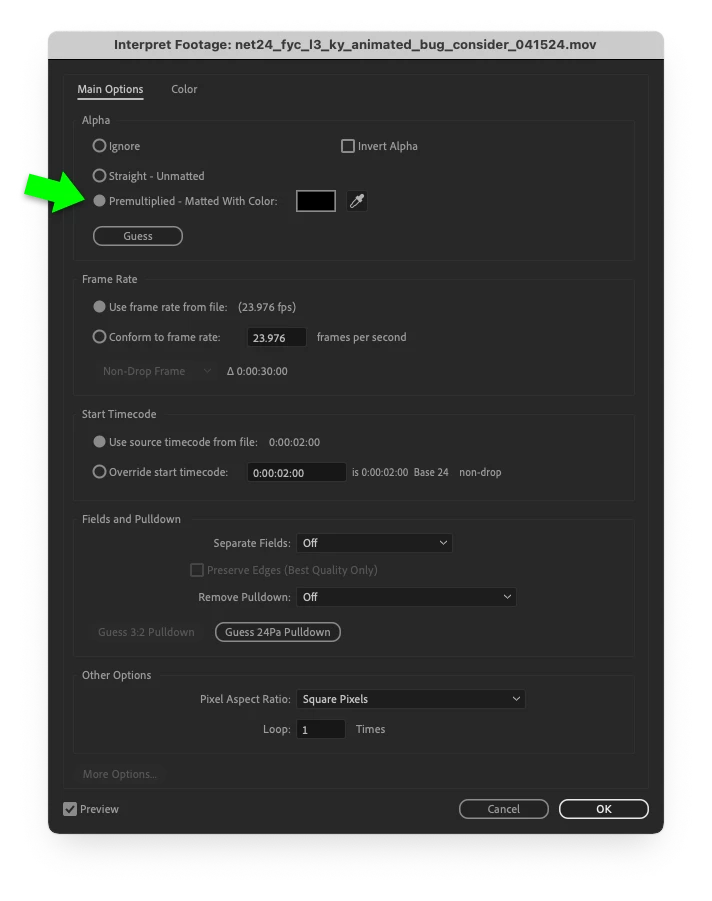 The footage is ProRes 4444 , and I'm running AE 24.3.0 on 2023 Macbook Pro with Sonoma 14.4.1.
