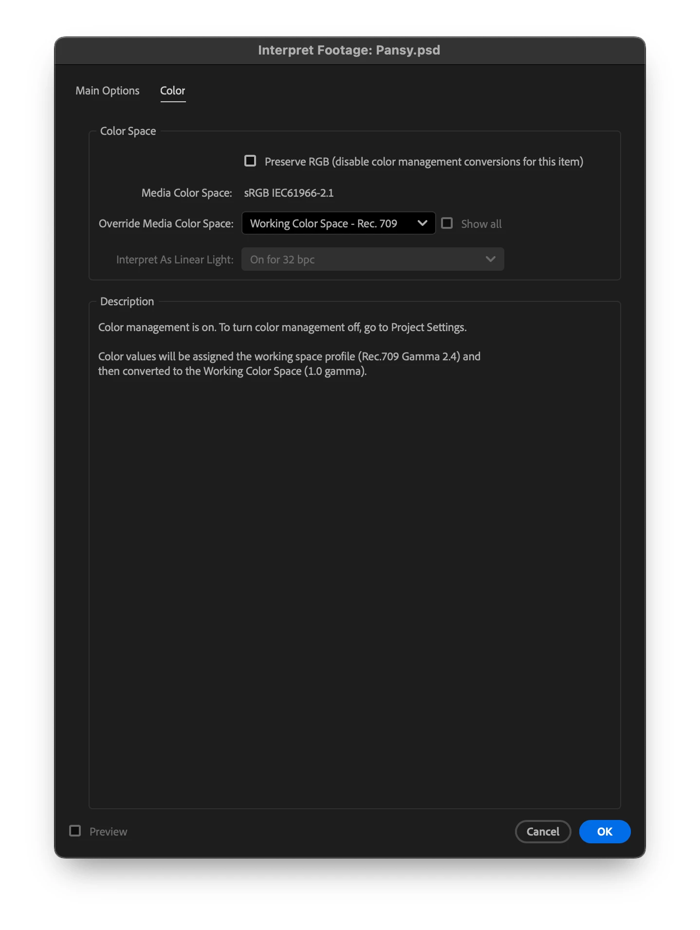 When I import PSDs into AE, the interpretation is not defaulting to the embedded profile, always to the working profile. Can anyone help me work out how to change this? If the PSD is sRGB, I want AE to respect that. Thanks