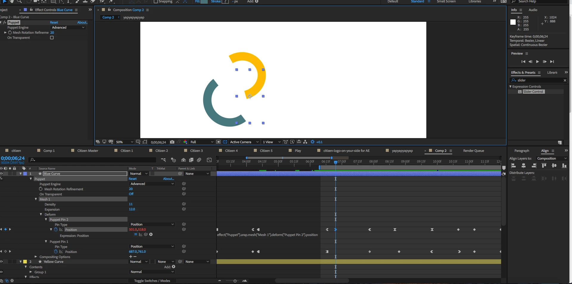 I have puppet pins on the top part and bottom part of this Blue C shape. They have become invisible along with the path of their movement but the animation and keyframes are still there. The puppet pins for the yellow curve are still visible when i select the yellow layer though, and I haven't changed my frame rate. I've searched online but I haven't really found anyone with the same problem. The only thing I've noticed that looks abnormal is the position properties for Puppet Pin 2 are red, even though I haven't manually put in any expressions.