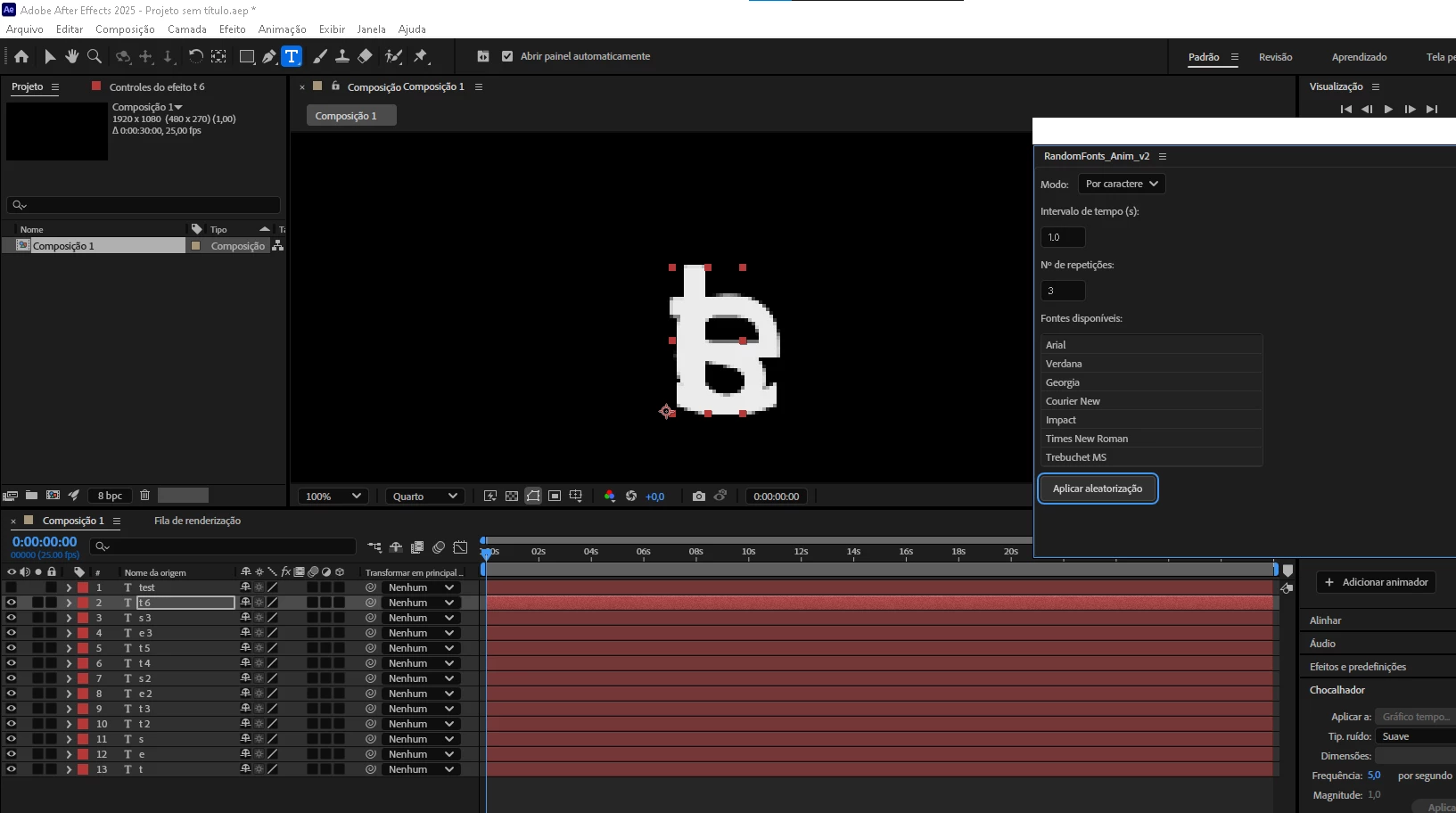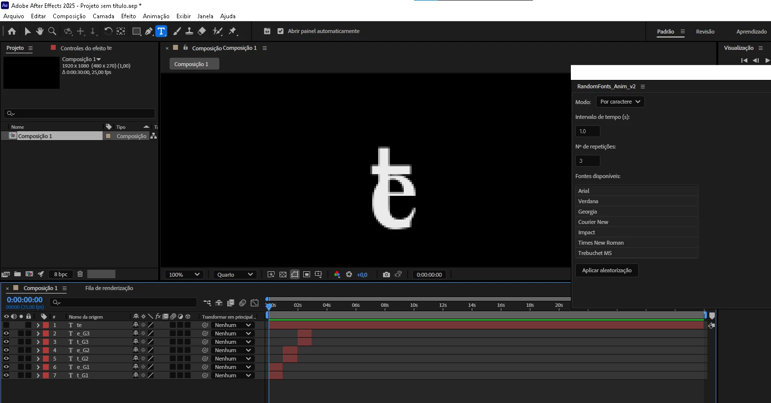 I'm using Deepseek and ChatGPT to try to make it work cause i have few to none coding abillities and it almost works. The thing is that After Effects can't change the font os characters individually so the script needs to take the text from the text layer and create a new text layer for each character and then randomize the font of the new text layers. So I did that part and it works, but for it to work the way I want to it needs to change the font multiple times, then I would need a unique layer for each character and font type. Also did that part and it works, but when running everything together with a simple cut to simulate the font changing it stops working. ChatGPT said it should work with long sentences but it barely works with 2 character words. Can anyone help me?