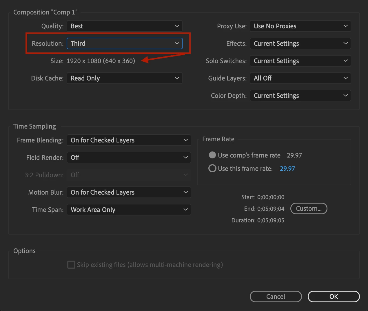 Of course I can create a new 640x360p composition put the original composition into it and scale to 33,3% but it will ONLY scale that composition and the render time will be the same as rendering 1080p.