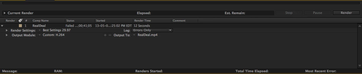 I am trying to render a 4 minute long montage in after effects, and no matter what I do it fails. After about 40 seconds or so, it just stops rendering and in the queue it says under status; Failed. I was thinking that maybe it was a problem with QuickTime, and maybe it couldn't create a file that big, but I tried almost every other format availiable but it will not work no-matter what. I am running CS6 on a MacBook Pro with 4GB of Ram, and am trying to render the file to a Hard-drive with over 800 GB availiable, so I don't think size is the issue. Any help would be appreciated. Here is a screenshot as more information might help. Thanks in advance. BTW I need to get this out A.S.A.P. so the quicker someone replies the better.