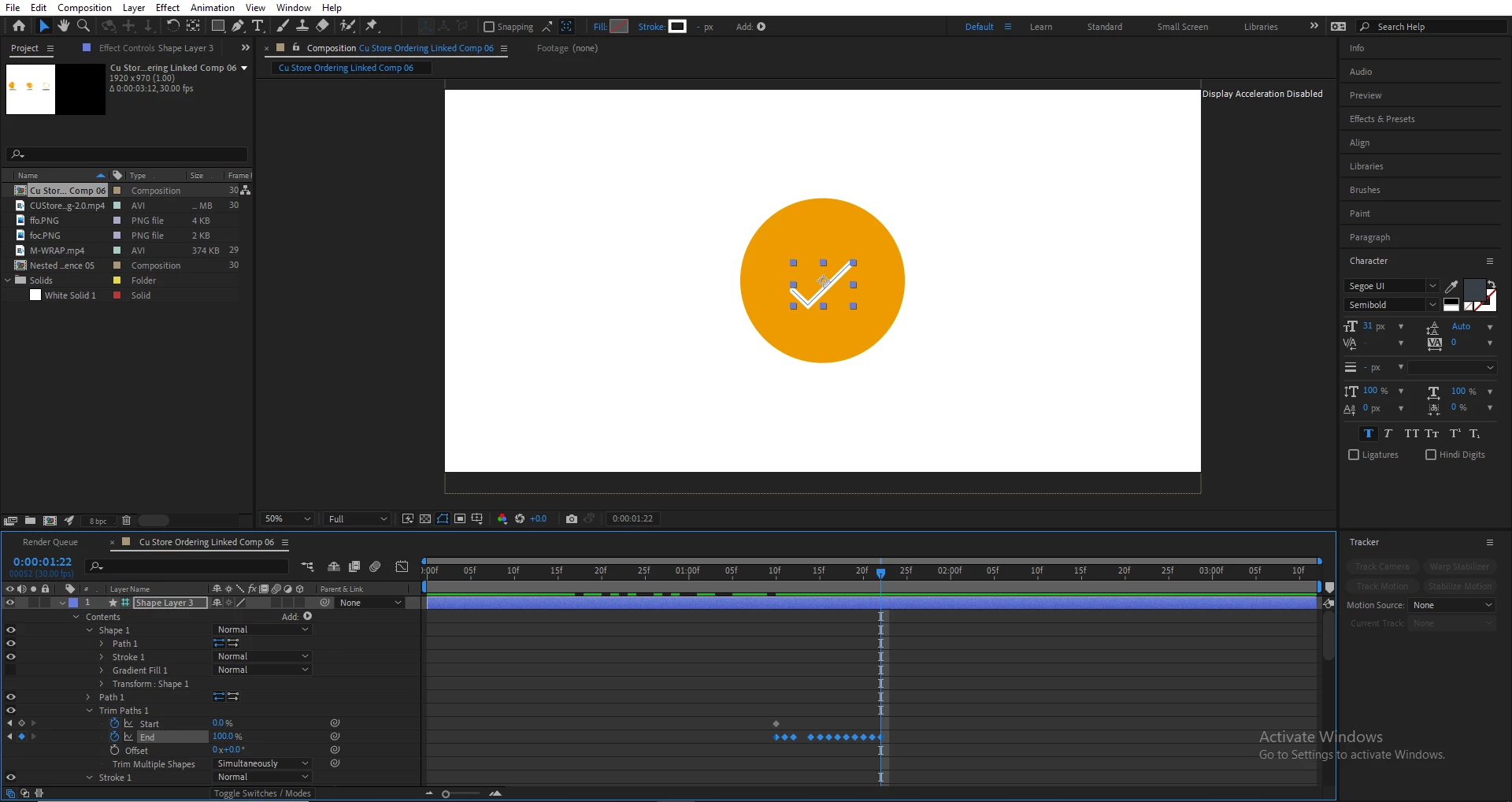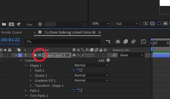 I am trying to animate a path via trim path in order to create a checkmark. I have attached a screen grab of my project to demonstrate how I achieve this animation. I notice that although the checkmark is visible on the preview montior, when I render the project (Lossless with Alpha) there is no checkmark visible in the output.