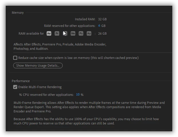 - After effects 22.6.0 with multi frame rendering unabled.
