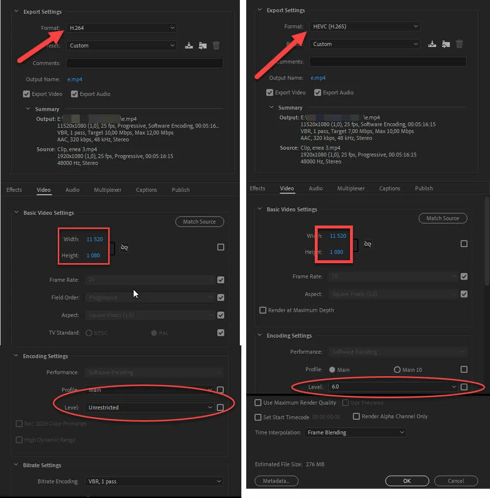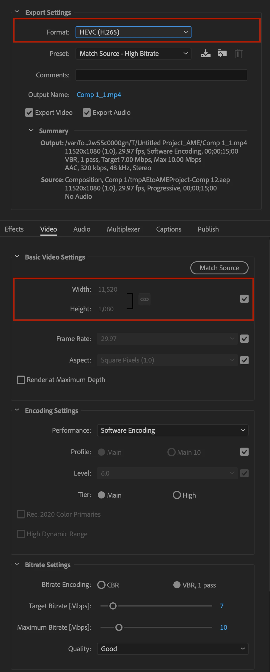Hello - I have a composition that is 11520 pixels w by 1080 pixels high. I seem to be only able to render it out in AVI format, which results in a very large file - 32gb. Is there a way to render this out as an MP4 with H264 or H265? I can't seem to keep the composition resolution rendering it out in anything but AVI.