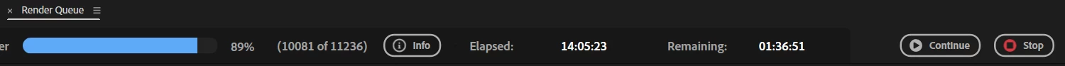 I'm rendering a 6 minute video in after effects. It's been going on for over 14 hours and stuck on 89% done.