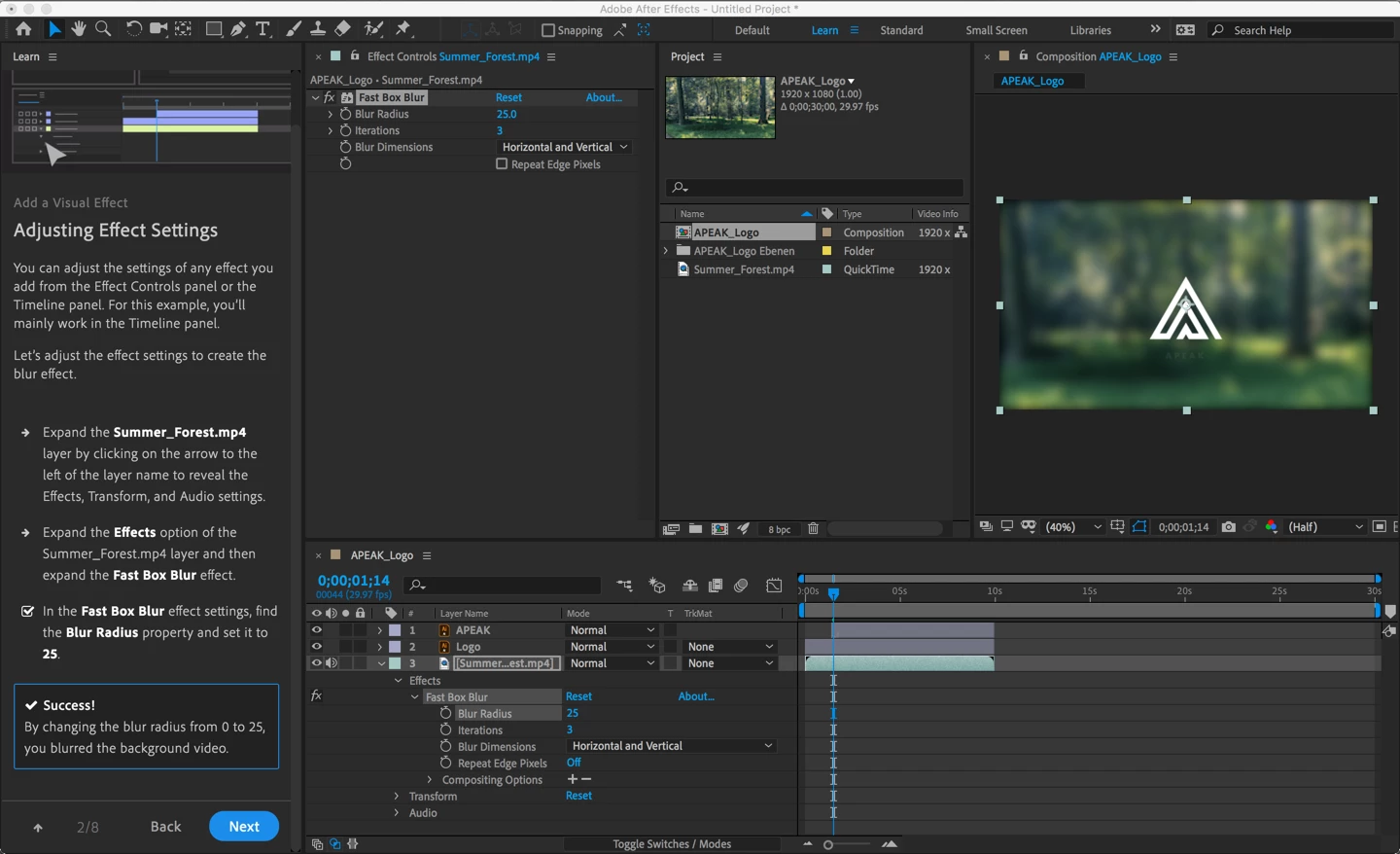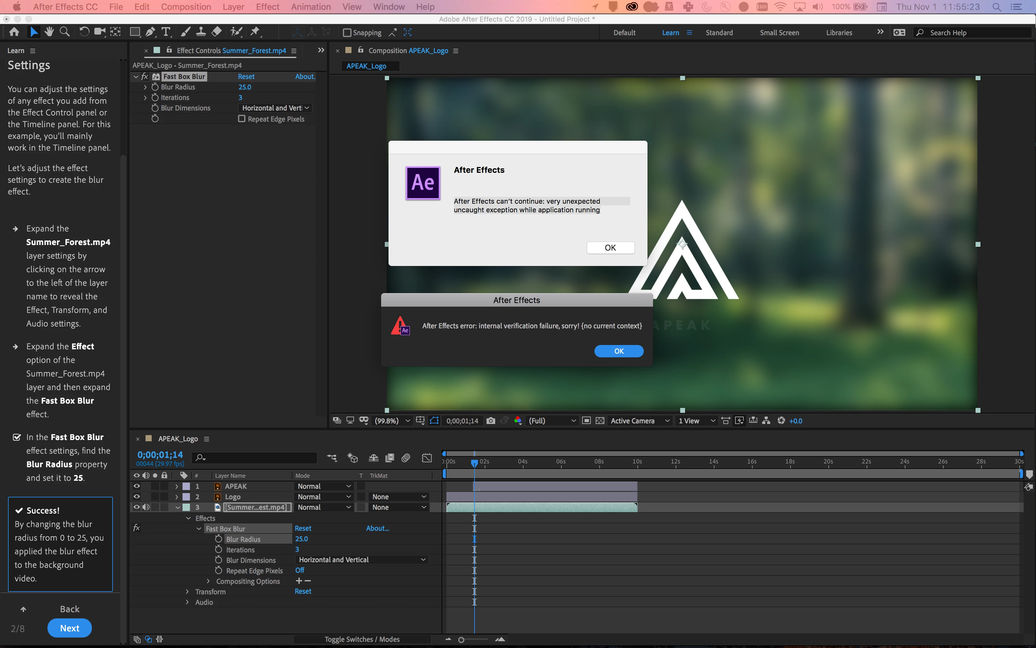 In the "Add a Visual Effect" tutorial, #4 of 5 in "Learn the Basics," I have been following the steps exactly, but the same thing is happening every time in step 2/8: After I add the Fast Box Blur effect to the Summer_Forest.mp4 layer, then change the Blur Radius property to 25 in the effect settings, hitting the tutorial window's "NEXT" button immediately crashes the app, which displays the following error messages in two consecutive pop-up alerts as it dies: