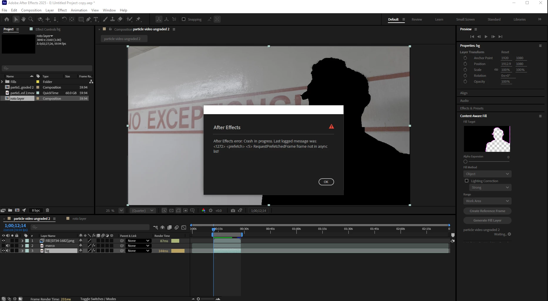 So im trying to do Content-Aware Fill on my rotoscoped subject in the black, but I keep getting either this error code or 'Rotobrush buffer size mismatch'. If someone could diagnose my problem that would be greatly appreciated.