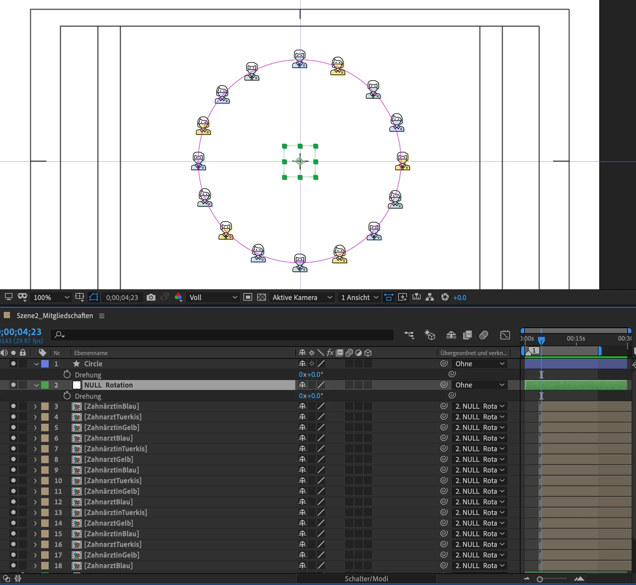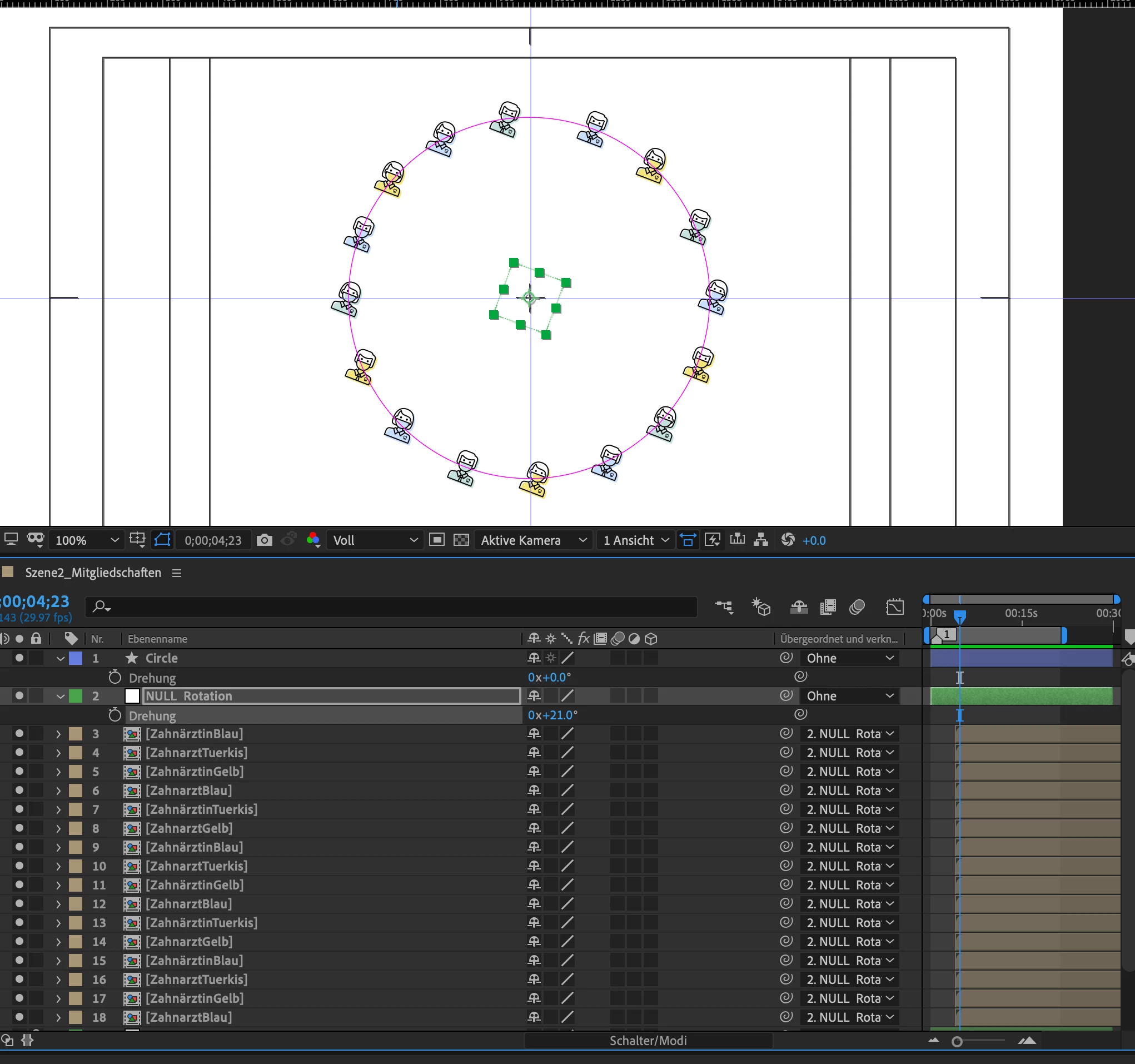 So the object is parented to the null wich rotating at the center of the circle and the object is rotating on its own axis in the opposite direction.