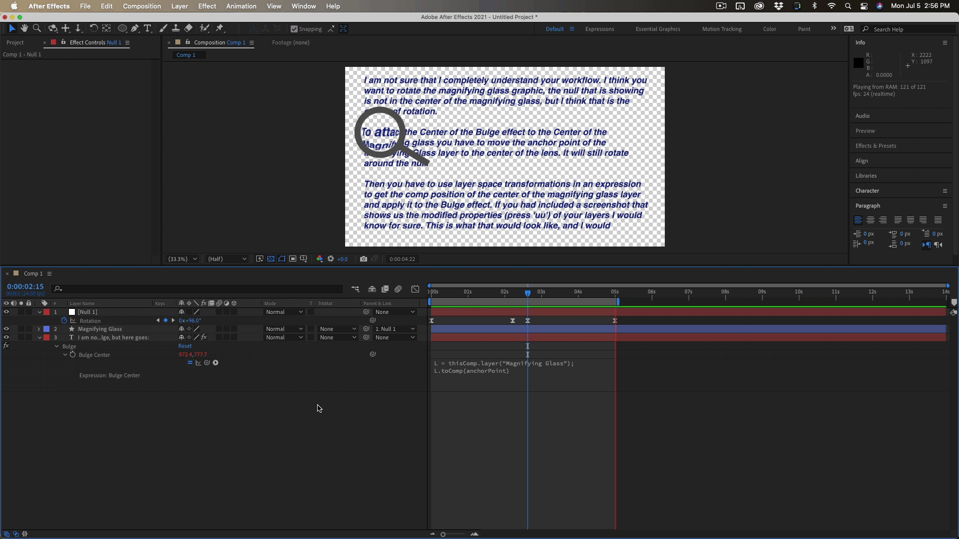 Methods online show to drag the pick whip of bulge center to the position of the null object. But since the null object rotates and doesn't have any position keys, doing that just causes the bulge to center in the top-left corner of the screen and not move.