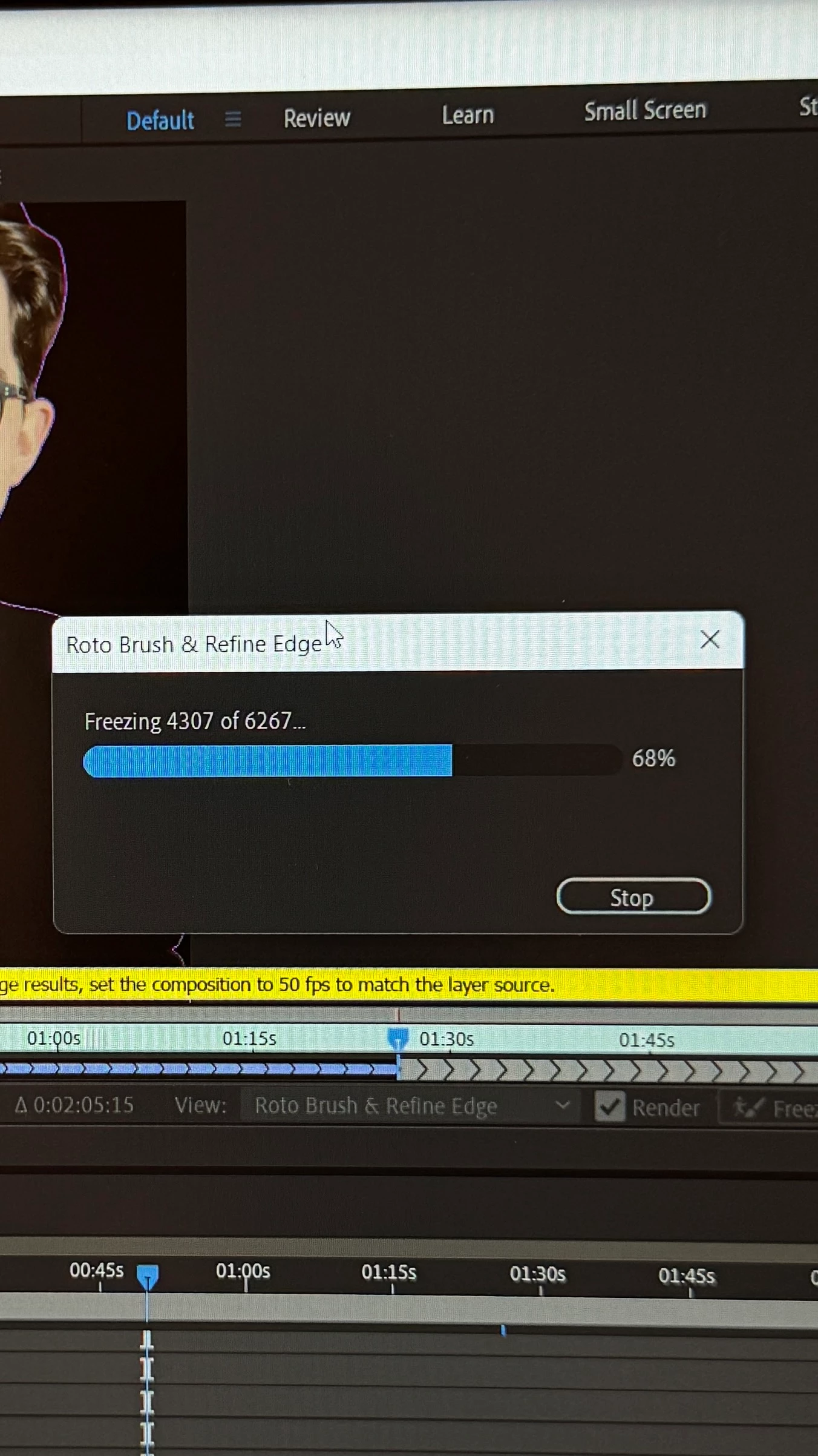 I’m using After Effects on my ROG Strix G15 with 16GB of RAM, intel core i7, GTX 1650ti and Windows 11. When I try to remove a background from a three-second video and click ‘Freeze,’ the rendering process involves around 6000 frames, which takes a long time.