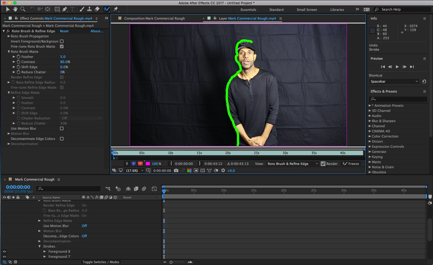 And when I try to go around a fully highlight the subject, the roto brush tool doesn't connect/isolate the subject in pink like it's suppose to. It just shuts off and goes back to normal like this (see image below):