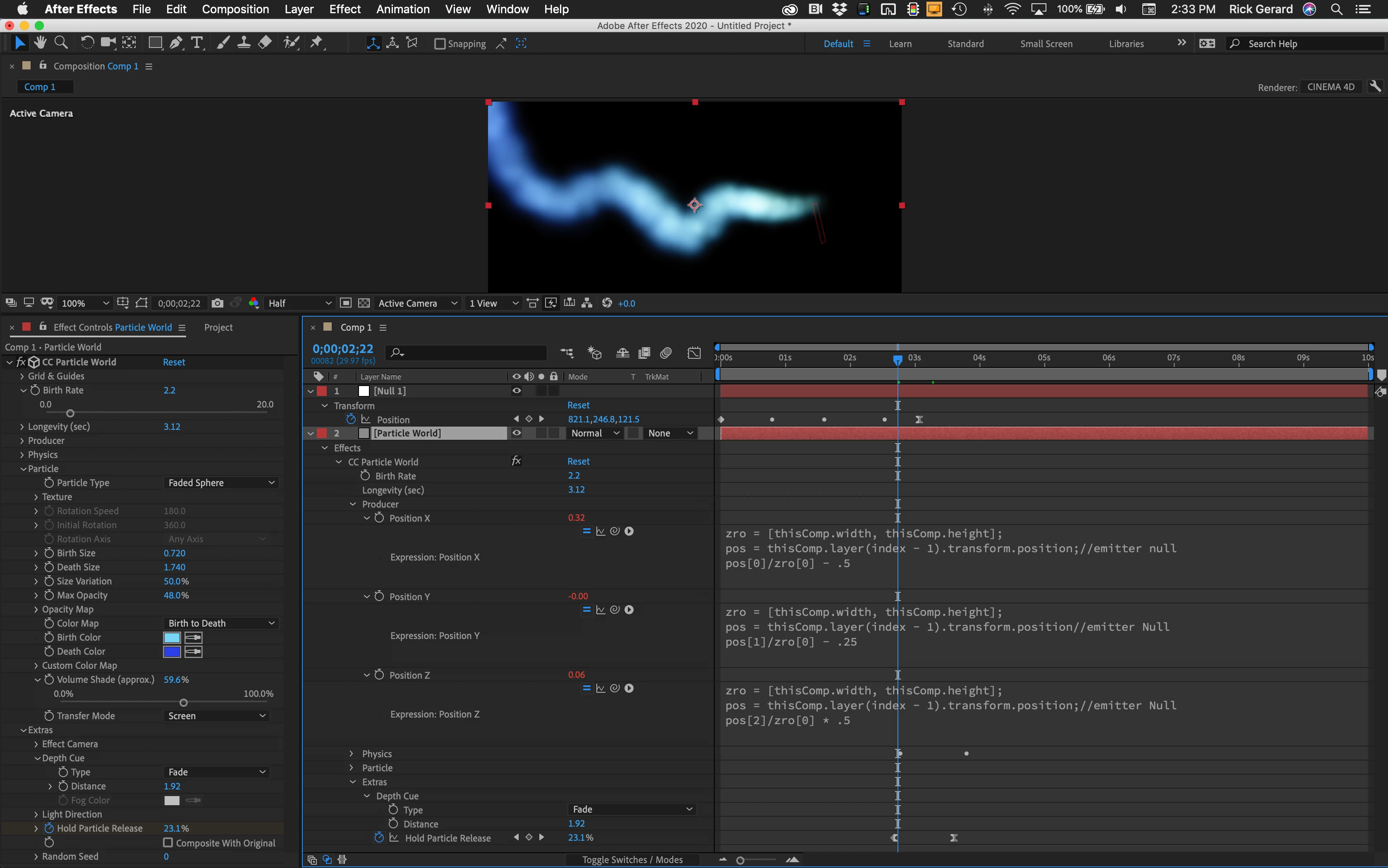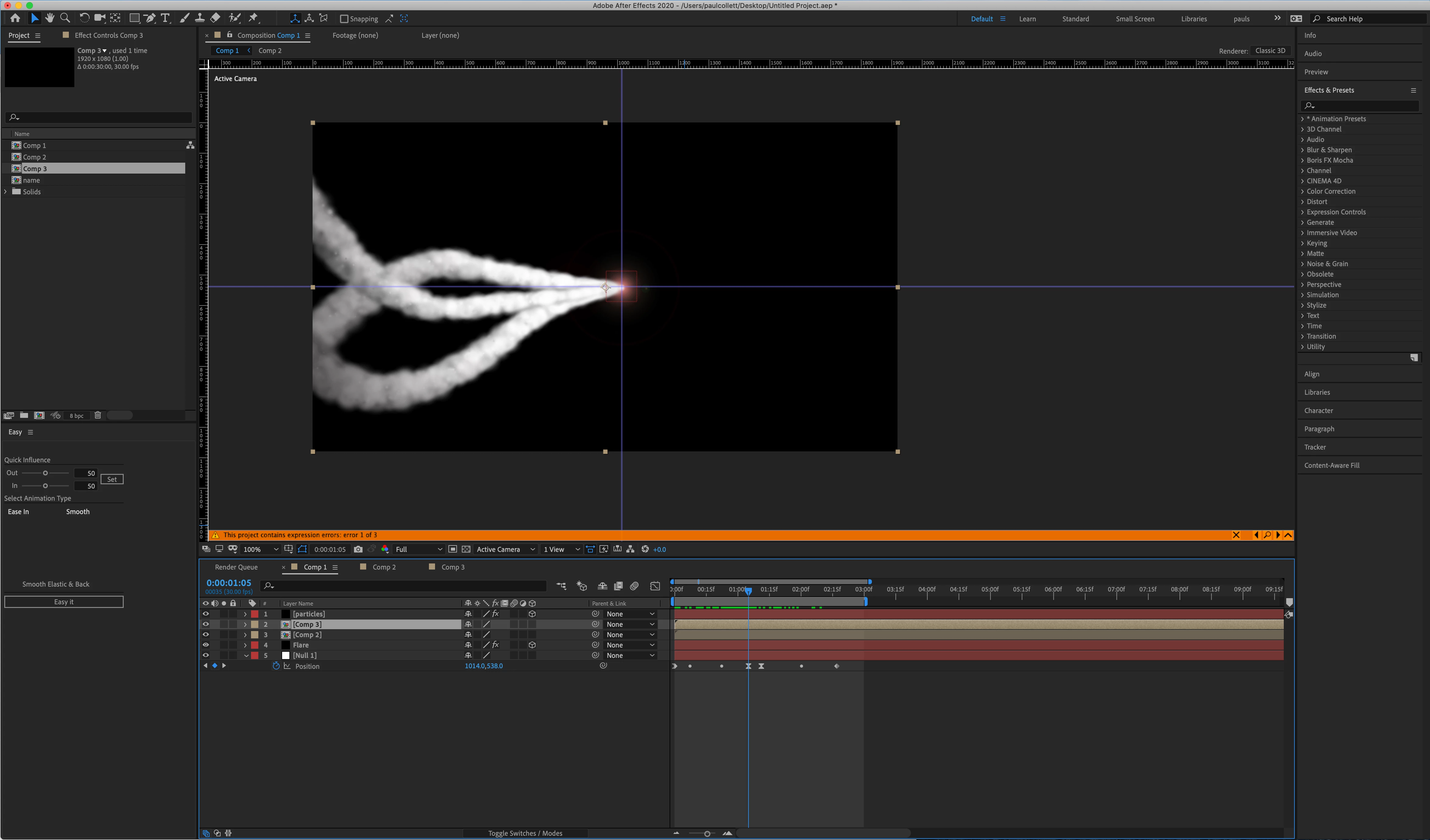 I'm fairly new to After Effects but slowing finding my way around. I was hoping someone could help me out. I'm trying to create a scene were three smoke trails com into a scene, merge into one, continuing to move forward (with the camera following) before hitting a wall. I have managed the smoke trails, but I can't work out how to get the camera to follow them, I seem to run out of comp space (dimensions 1920 x 1080)