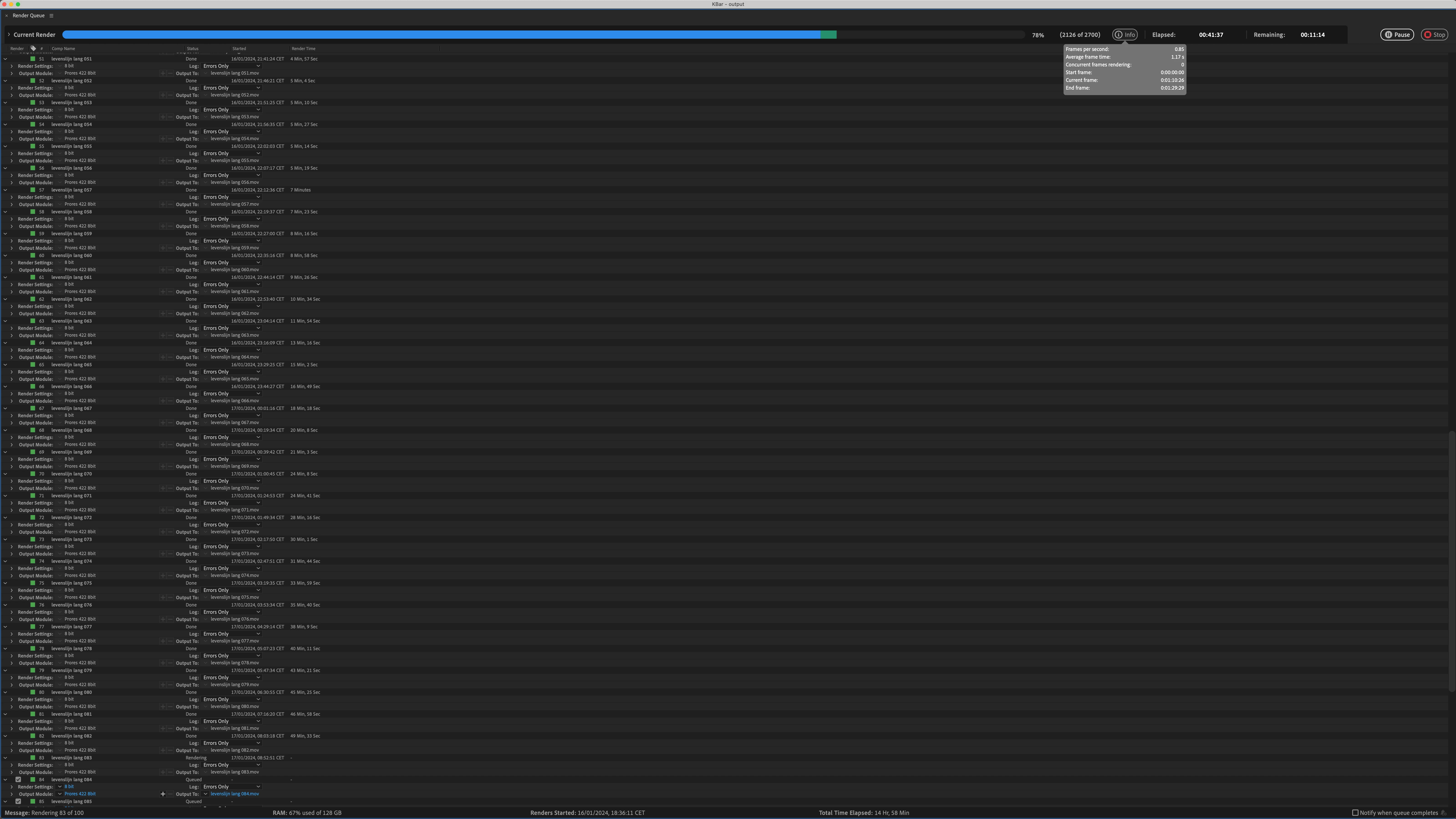 Last night I set up a render queue with about a hundred comps that are basically the same (a 1m30s text animation, the actual text is only thing difference between the comps). First 50 took about 4 to 5 minutes per comp to render, then it suddenly went up, now taking over 50 minutes for the same kind of comp. There is a green part in the renderbar and the render is still progressing (sometimes showing a lightgreen part in the bar), but checking the info it says 'Concurrent frames rendering: 0 '. This seems incorrect.