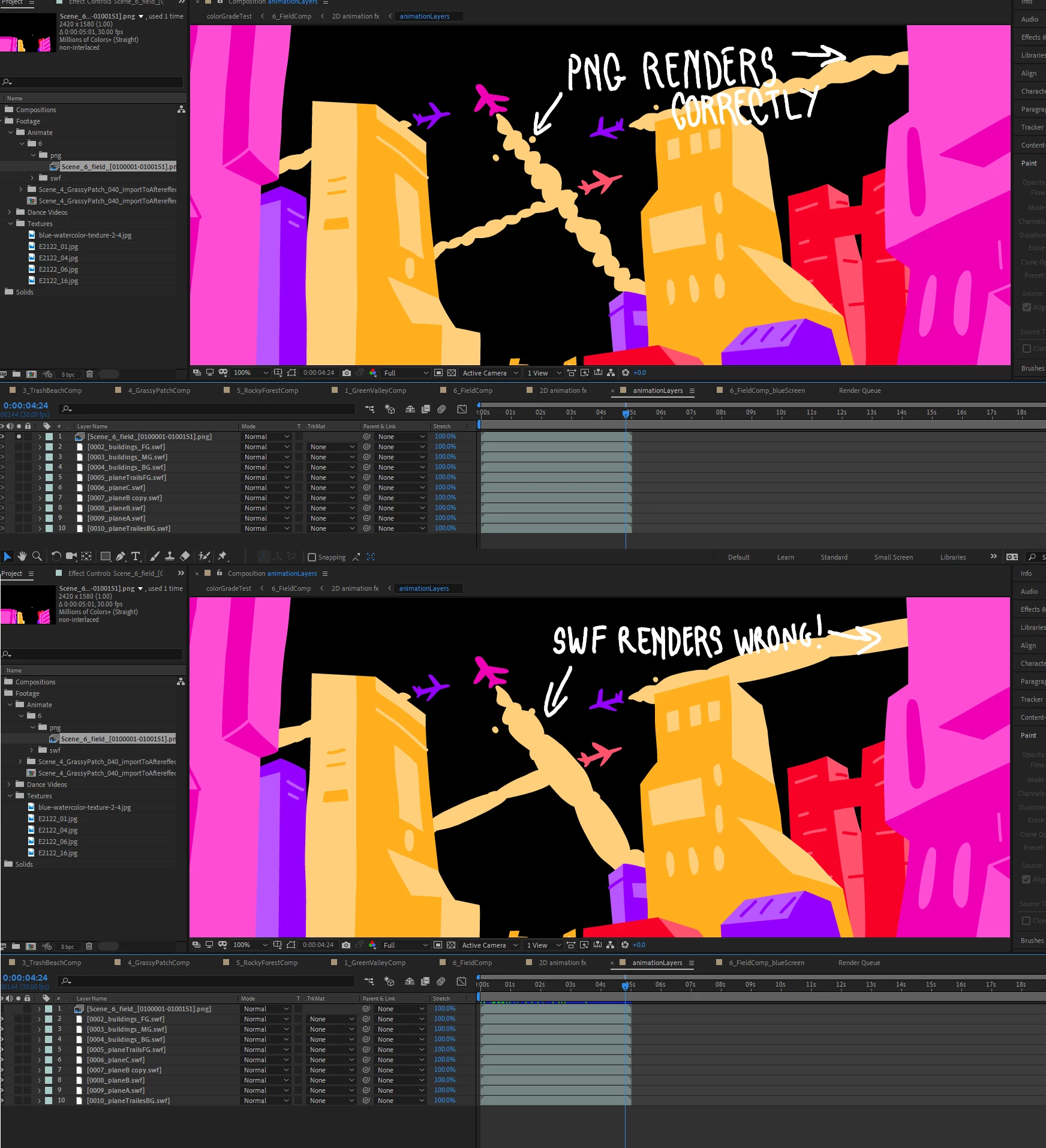 So, I'm noticing some discrepancies between Adobe Animate CC 2019 and Adobe After Effects CC 2019 after importing an SWF. I've got advanced layers turned off in Animate, and most of it comes through correctly, but some of it just doesn't match up. I noticed that a motion tween that was set to 'bounce' was coming through wrong, but different easing seemed to work. Additionally, if you look at the contrails on the images below - it comes through perfectly when exporting a png sequence (top image) but wrongly when export a set of SWFs (bottom image). Those trails are somewhat complex (they're a symbol containing 4 instances of a second symbol containing some masked layers) but certainly display correctly in animate and the PNG export, so I can only conclude that it's a bug in the SWF rendering in After Effects? Using PNG sequences for the minute as a workaround.