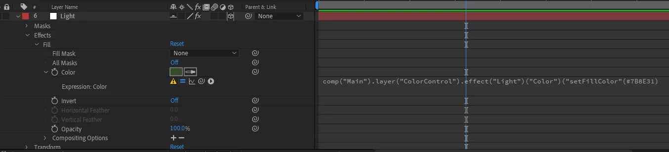 I've tried various commands such as comp("Main").layer("ColorControl").effect("Light")("Color")("fillColor#7B8E31") and "ColorControl#7B8E31") but keep getting error warnings.