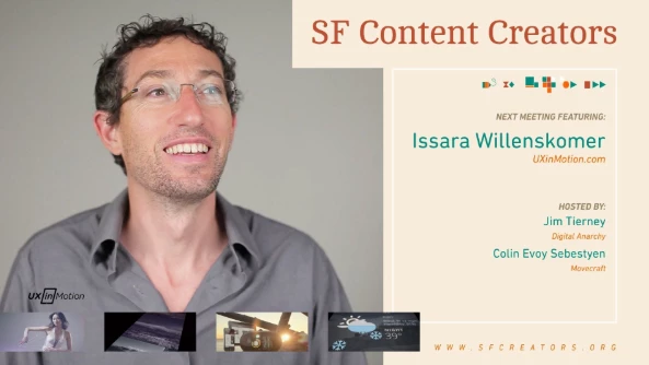 Issara has personally trained the design teams at Dropbox, Slack, Airbnb, Salesforce, Oracle, and others. Issara currently teaches motion innovation both online and in the real world. Also at this meeting will be regular SF Content Creators hosts Jim Tierney and Colin Evoy Sebestyen.