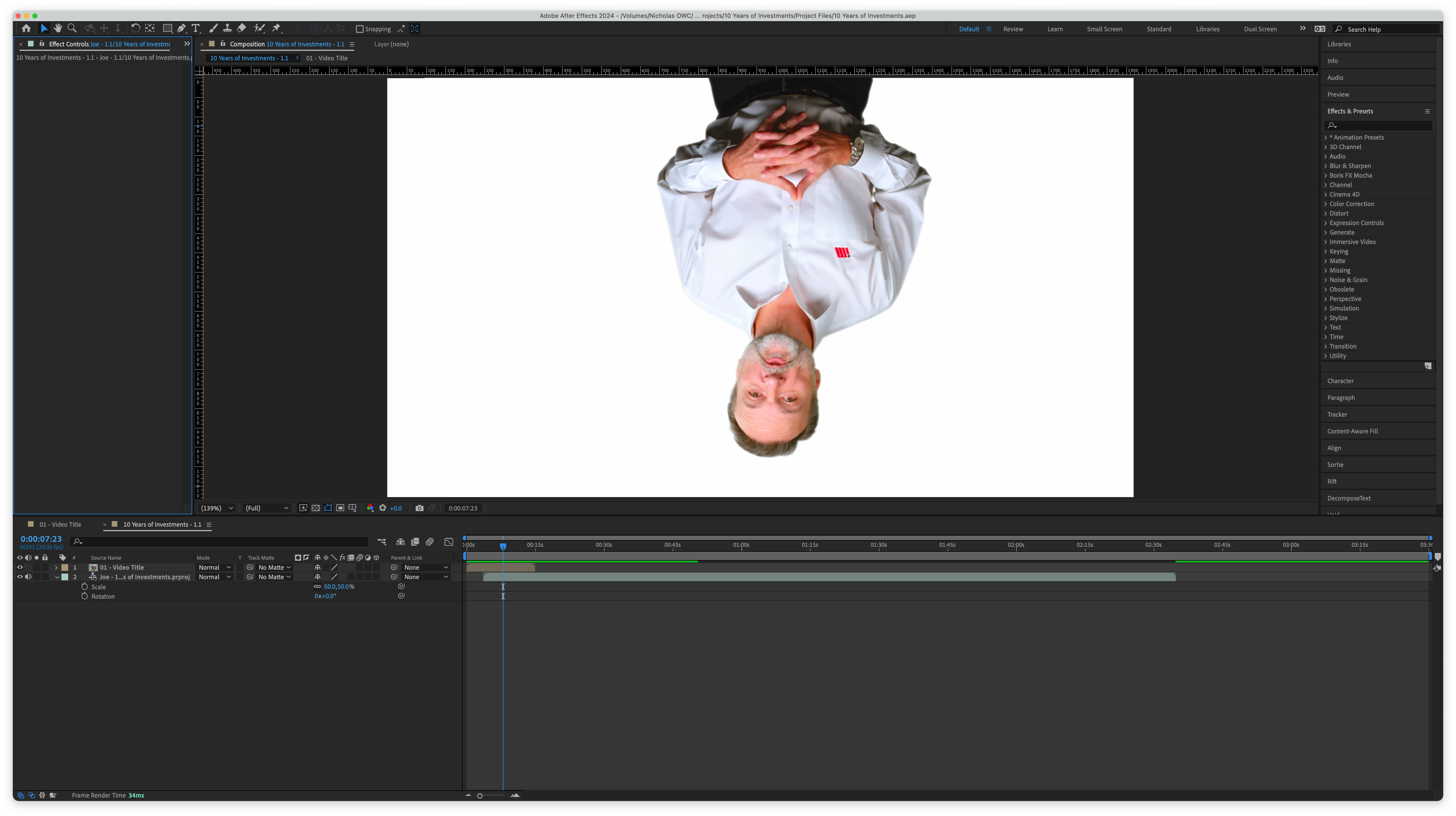I've imported a Premiere Pro sequence via Dynamic Link into my project. At frame 191 of the composition, the layer is rotated upside down. The rotation property has not been modified, and there are no effects on the layer that would yield this result; the only transformation that's been applied to the clip is that it's by scaled down 50%. (See screenshot.)