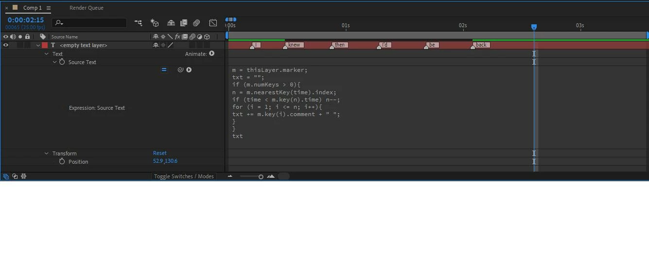 I have a text layer with markers containing the individual words. These markers are synced to words of a voiceover and when a word is said, the word slightly slides up.