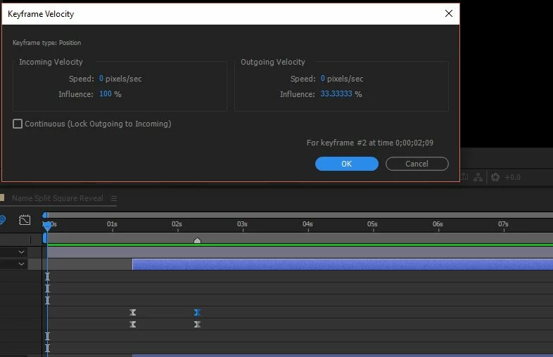 The shape layer in question has key-framed animation on both the x-scale, and the x-position. The keyframes are eased and velocity adjusted as below.