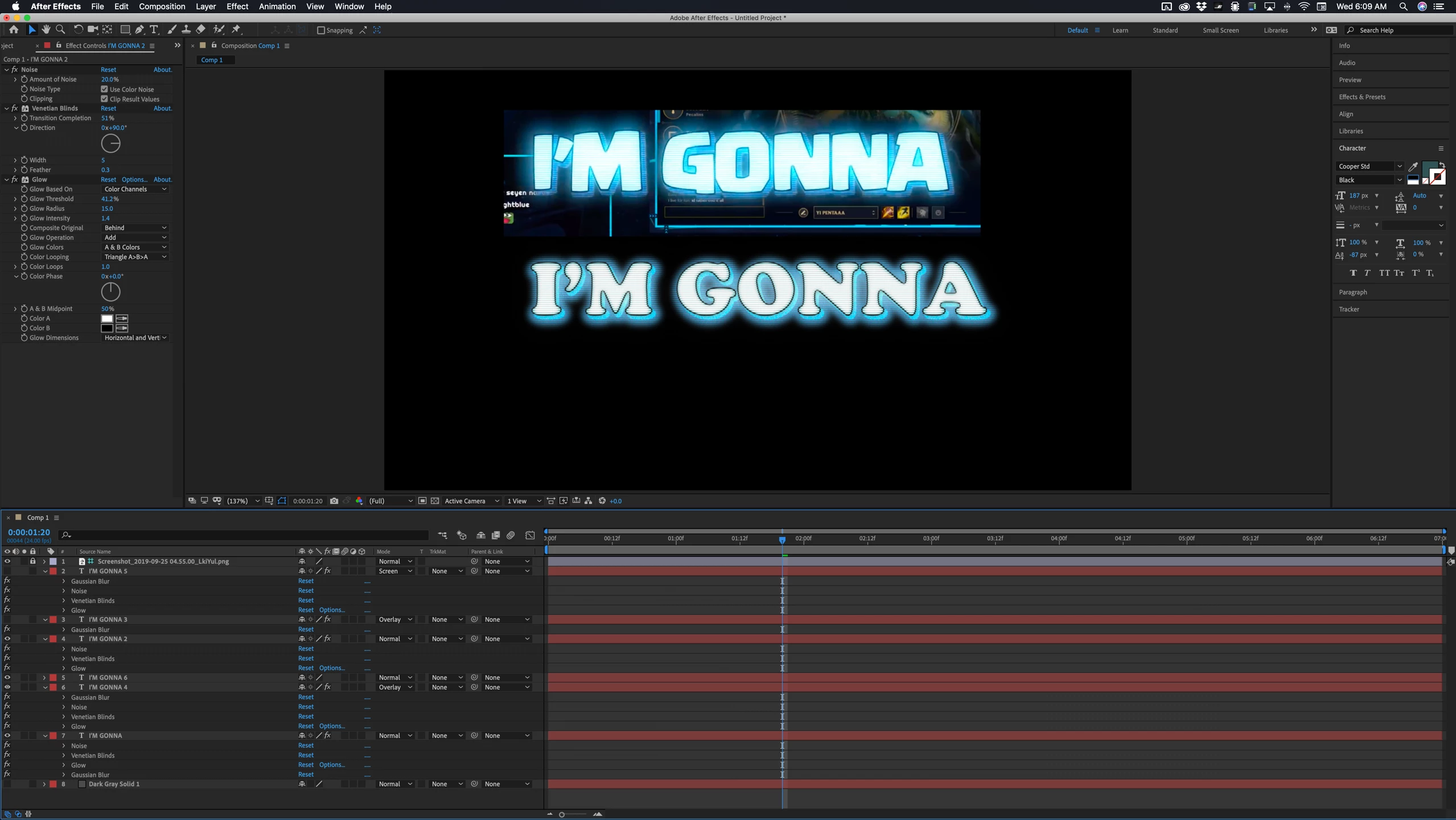 Now that you have an idea about what is going on you start to build your layers. Step 1 for me would be to load up a screenshot of the text effect for reference, make it a guide layer and lock it so you have something to refer to. Then I would be to add a text layer to the timeline, duplicate it, add a stroke to the top layer and change the fill color of both layers. The next step would be to try and duplicate the scan line effect on both layers. There are a lot of ways to do that. A good way to try a bunch of things quickly would be to take a look at some of the animation presets already available in AE. You could throw Bad TV a the top text layer and then turn off all of the effects that are applied, then start turning them on one at a time to see what you get. Keep the ones you like then see what else needs to be added. Solo the top text layer and fiddle with things like Venetian Blinds, Glow, Gaussian Blur.  This is what about 5 minutes of fiddling got me, and that is how you create composites like this.