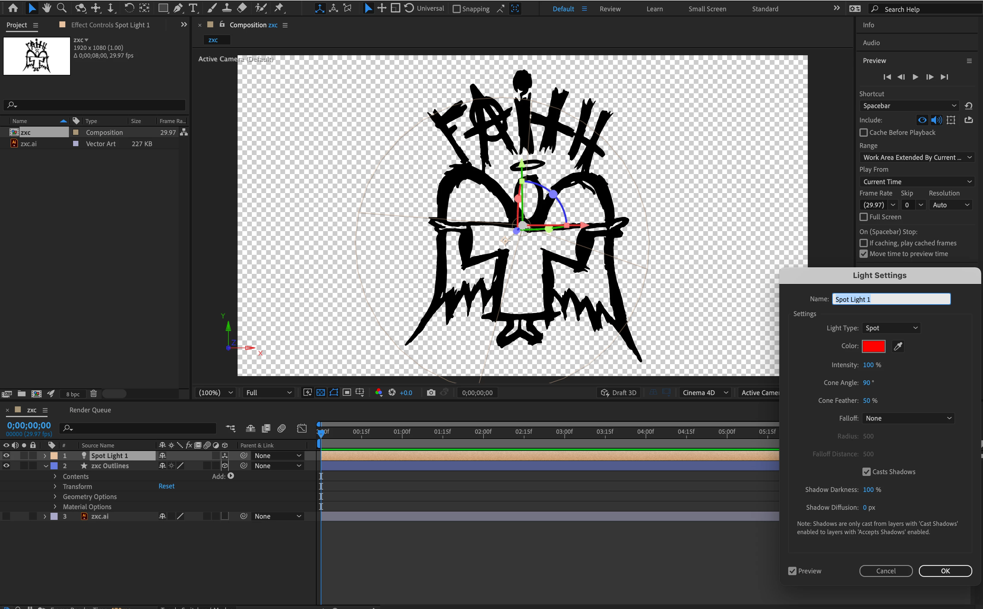 I'm trying to add a spot light on this 3d spinning logo. (I'm going step-by-step with a/multiple youtube videos.) I do exactly what they do in the video. I start with creating a shape from the vector layer. I make the outline layer 3d. I add extrusion depth. The next step I've been seeing on these videos is New > Light > Spot Light with the settings that I show in the screenshot. And as it shows in the screenshot, the spotlight doesn't appear. I'm not sure what I'm doing wrong, any help would be much appreciated. Thanks