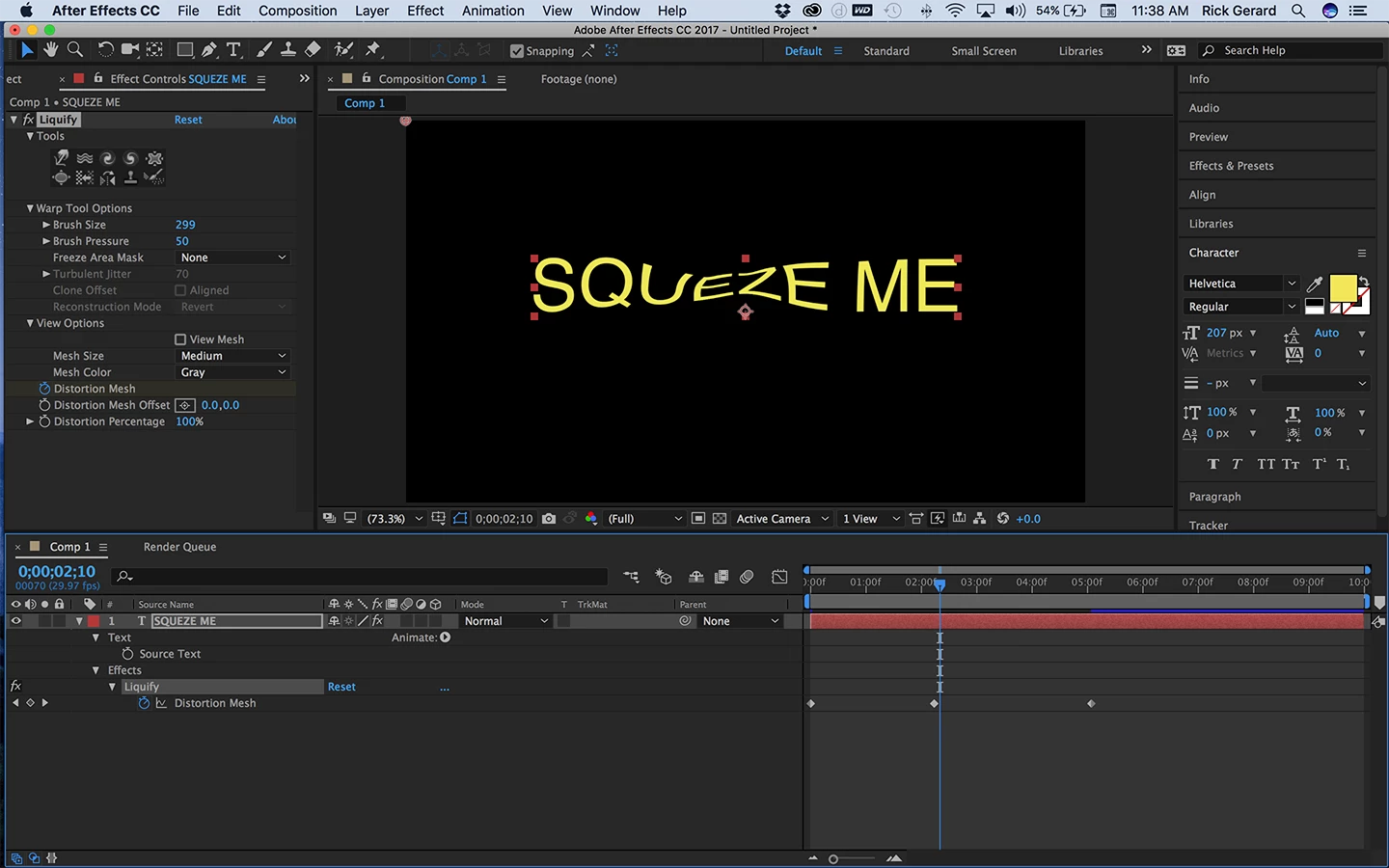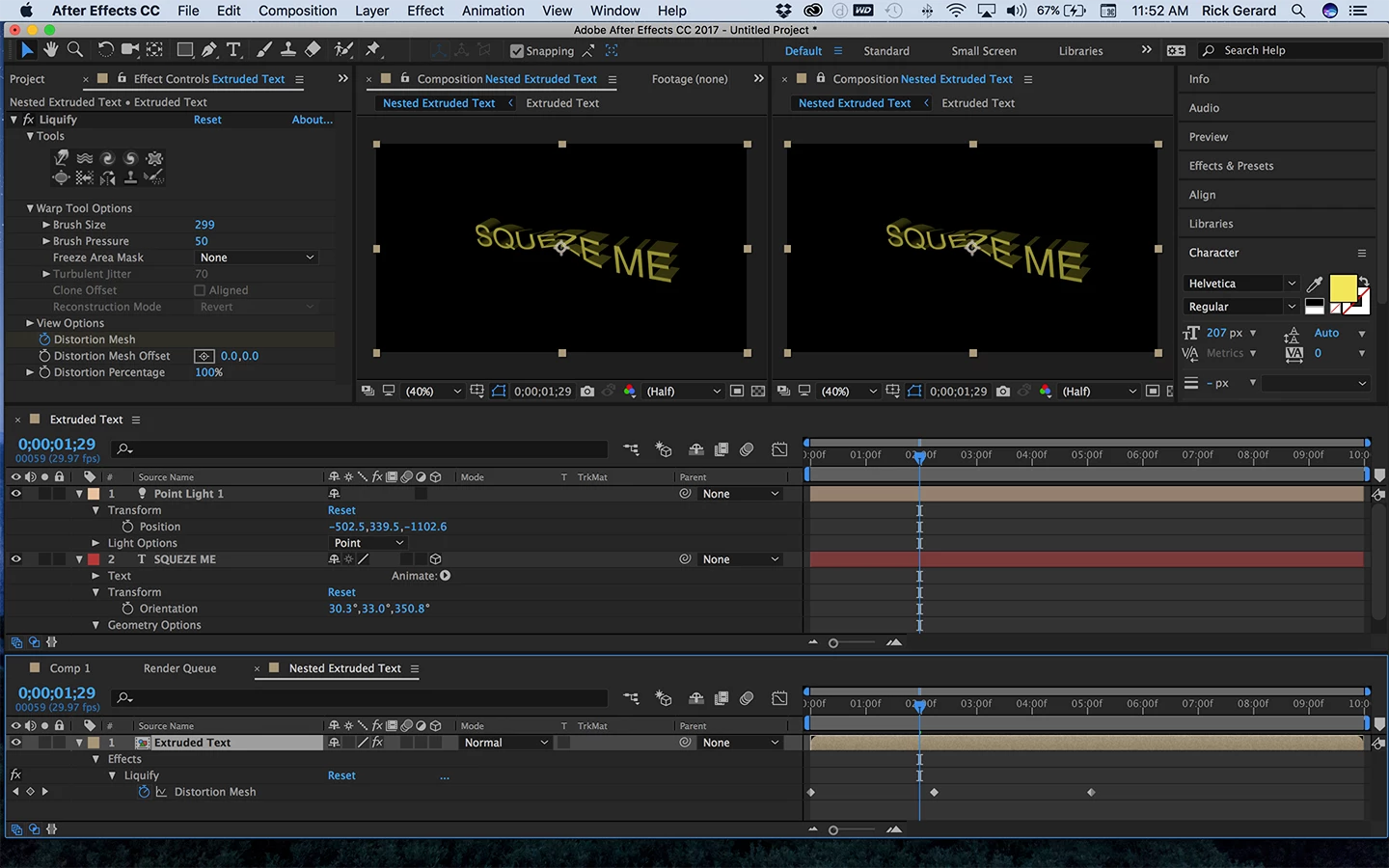 No, wait, there's even a faster way to simulate a squeeze on extruded text if there is no camera move. Set up a comp that is only a couple of frames long, add a text layer, change the renderer to C4D and extrude the text. Add lights as necessary to get the look you want, then export a single frame as a tiff or Photoshop file. Now bring your still image into your main comp and apply one of the distort filters like liquify to get the look you want and then render. No need for slow rendering extruded text in the final composition.