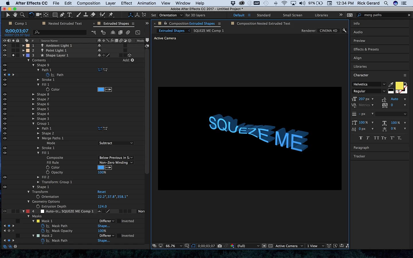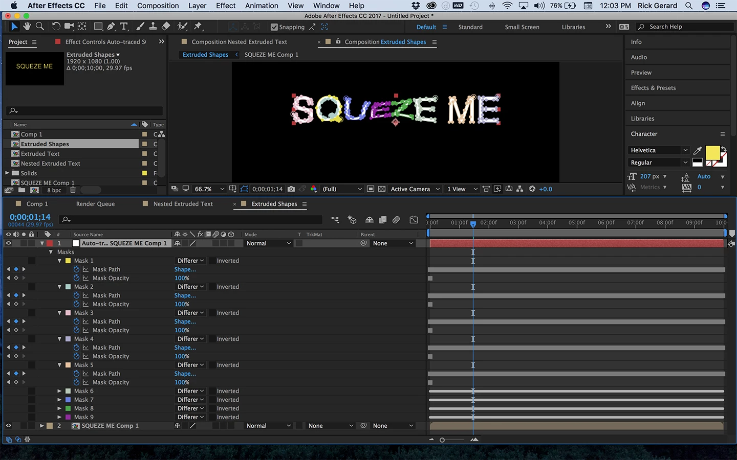 The other way would be to convert the distorted text layer like the one shown above into outlines, turn those outlines into shape layers, place the shape layers in a C4D Renderer comp and extrude the shape layers. You start by pre-composing the distorted text layer moving all attributes to the pre-comp. Then you apply Auto Trace from the Layer menu to the nested comp, your pre-composed text layer, and have it create a new layer. Make sure that the work area includes all of the animation so you get animated outlines. This may take a while if your animation lasts more than a couple of seconds. This will give you a new solid with a bunch of animated masks that looks something like this: (I collapsed some of the masks to show you all the layers in the comp)