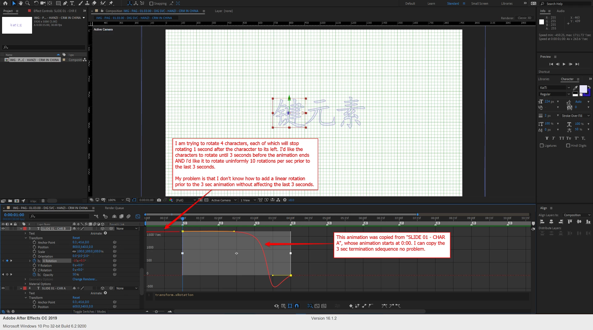 I have 4 (Chinese) characters, each in a separate layer, horizontally aligned over a 15 sec timeline. 3D turned on for each character. I'd like to:
