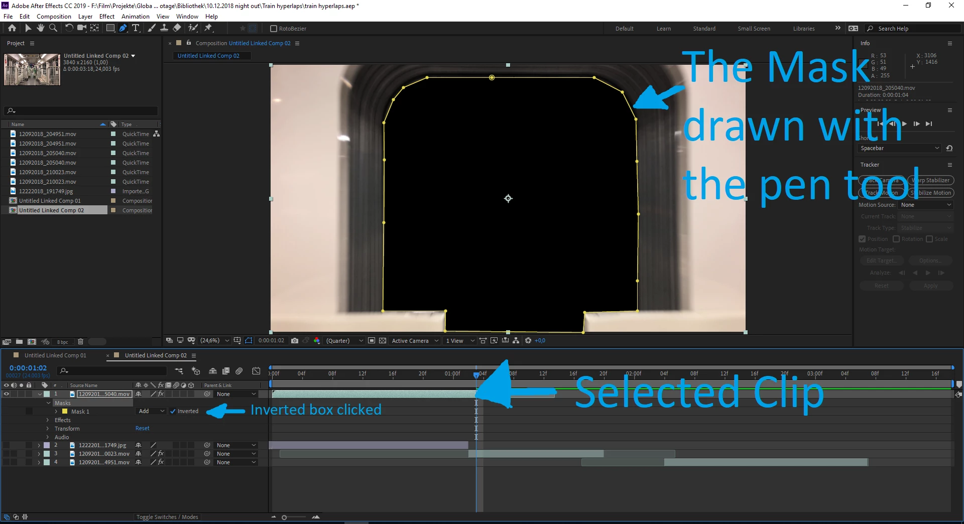 1. This is my selected clip. I pick the pen tool and draw a mask into the frame. Then I click "inverted" to cut out the area within the mask.