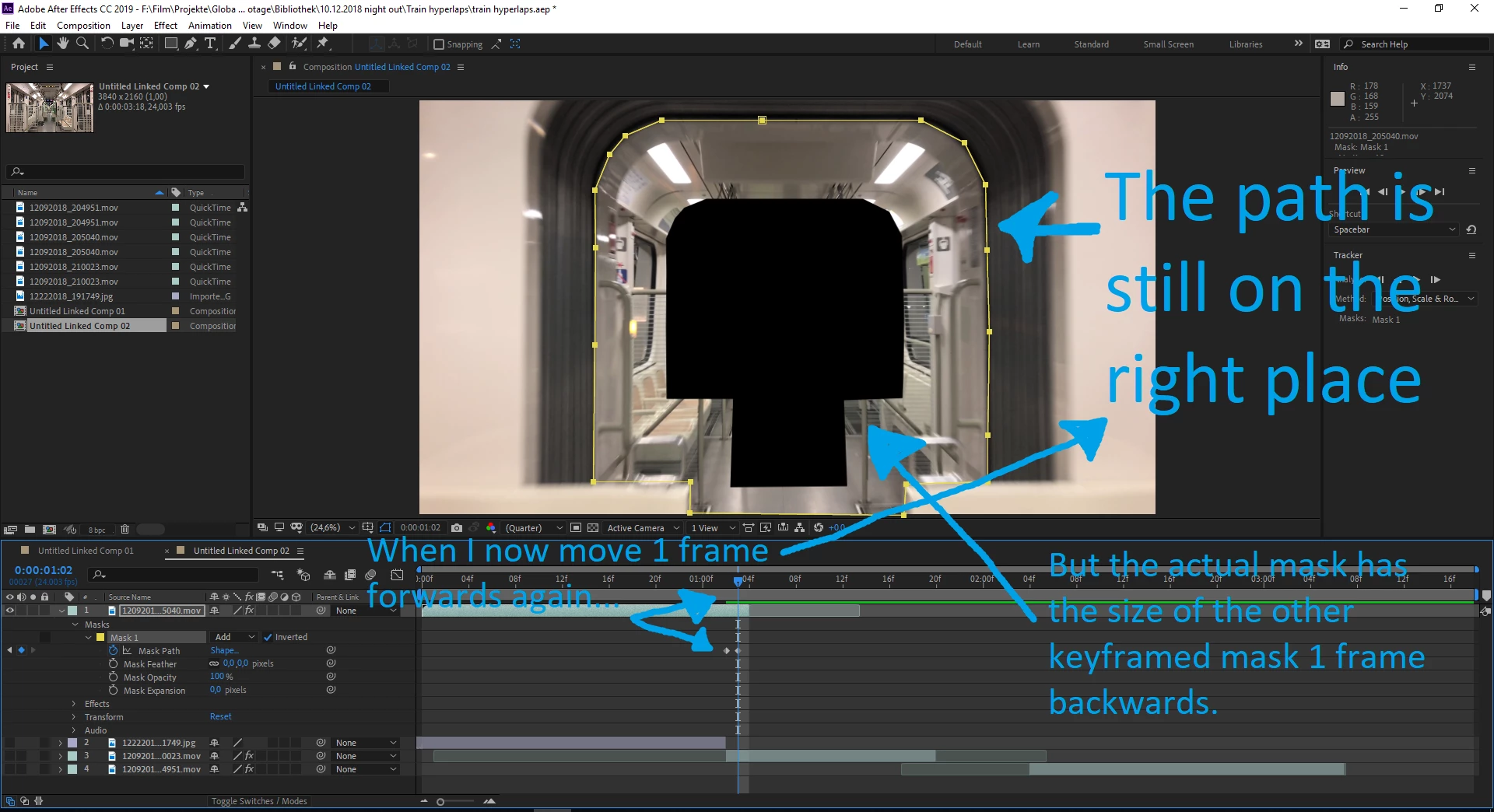 5. when i now move the playhead 1 frame forwards again to the previous frame, although the path is still on the right place, the actual mask is not! The actual mask has the size of the other frame wich was last edited. would i move on and edit frame by frame backwards, the actual mask size would always stick to the last keyframe i've edited.