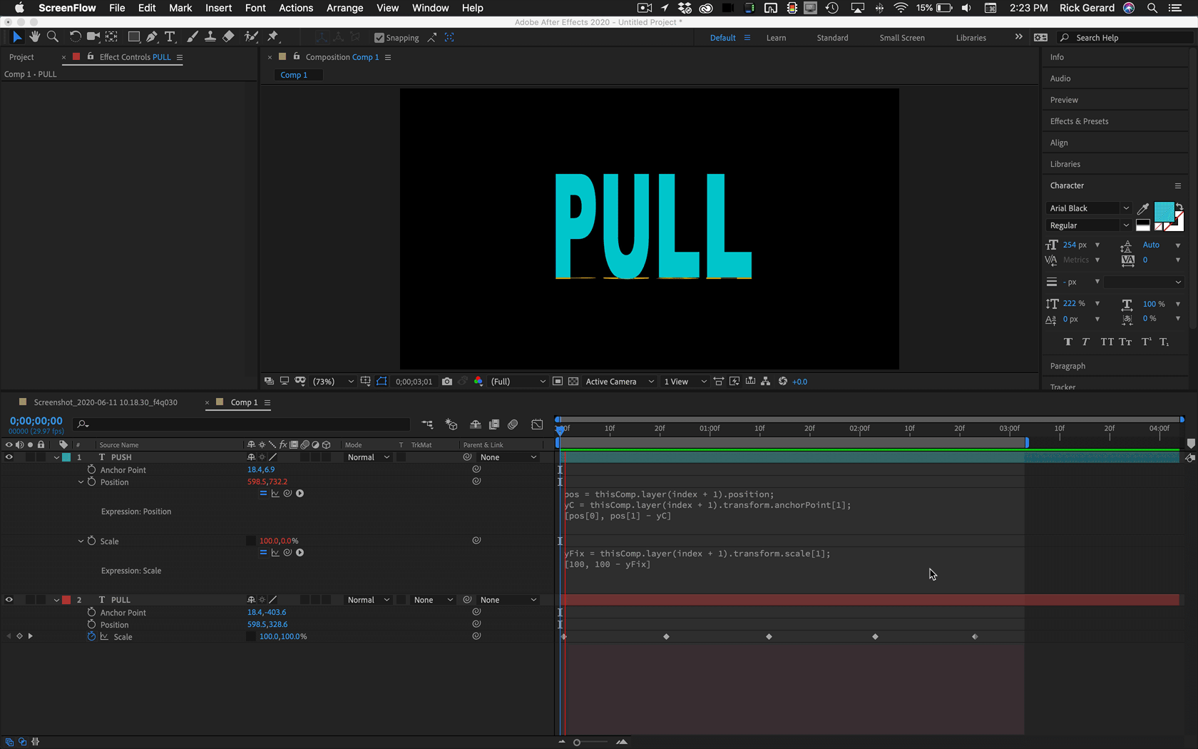 Two text layers, properly positioned anchor points, animate Y scale, and drive the other layer's position and scale with expressions.