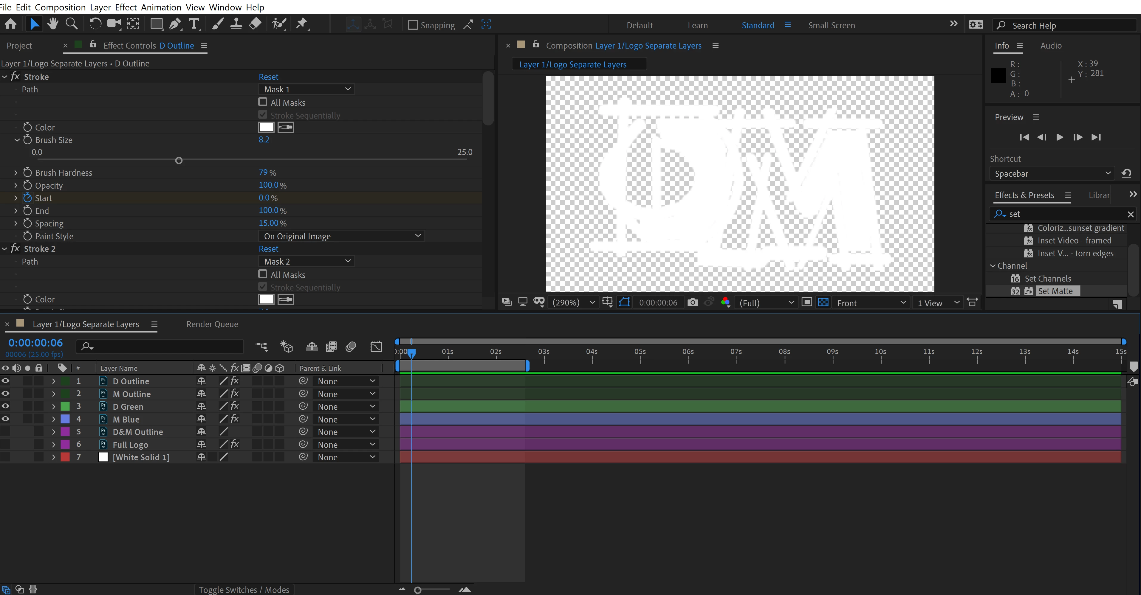 I've been putting together a write on effect for a logo animation and want to export it with a transparent background. I've just noticed that once I remove the solid colour BG from the comp, the stroke outlines are still visible. When exporting the project using RGB + Alpha the strokes are still visible on the export and the letters write on over the top. Is there any way that I can hide the stroke from the comp? I've attached an image of the project which should show what I mean a bit better.