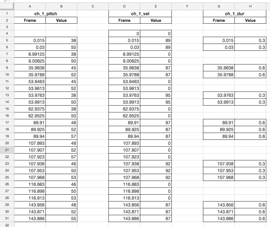 I don't understand how the duration channel is working with the value given, but the values only appear where there is an 'on' state for a midi number.