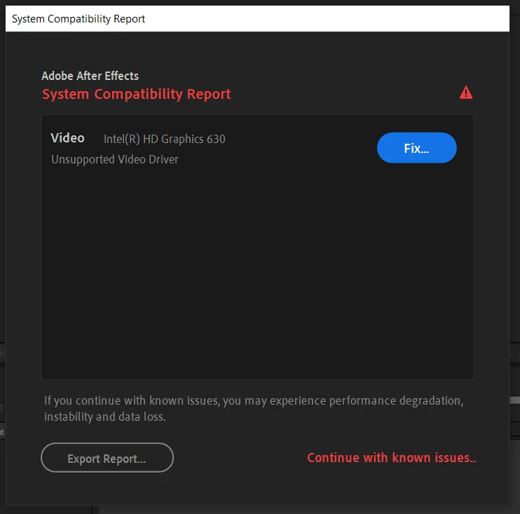 System compatibility report: Unsupported Video Driver Intel HD graphics 630 [AE 2020] [Windows 10]