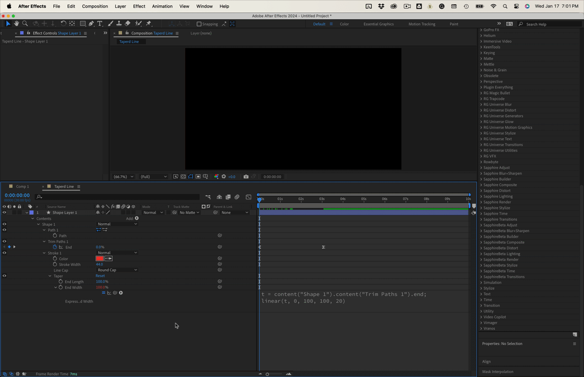 The trick is setting up a linear expression that modifies the end width from 100% to 20% as the trim path draws the line. To make things look better, I selected Round Cap.