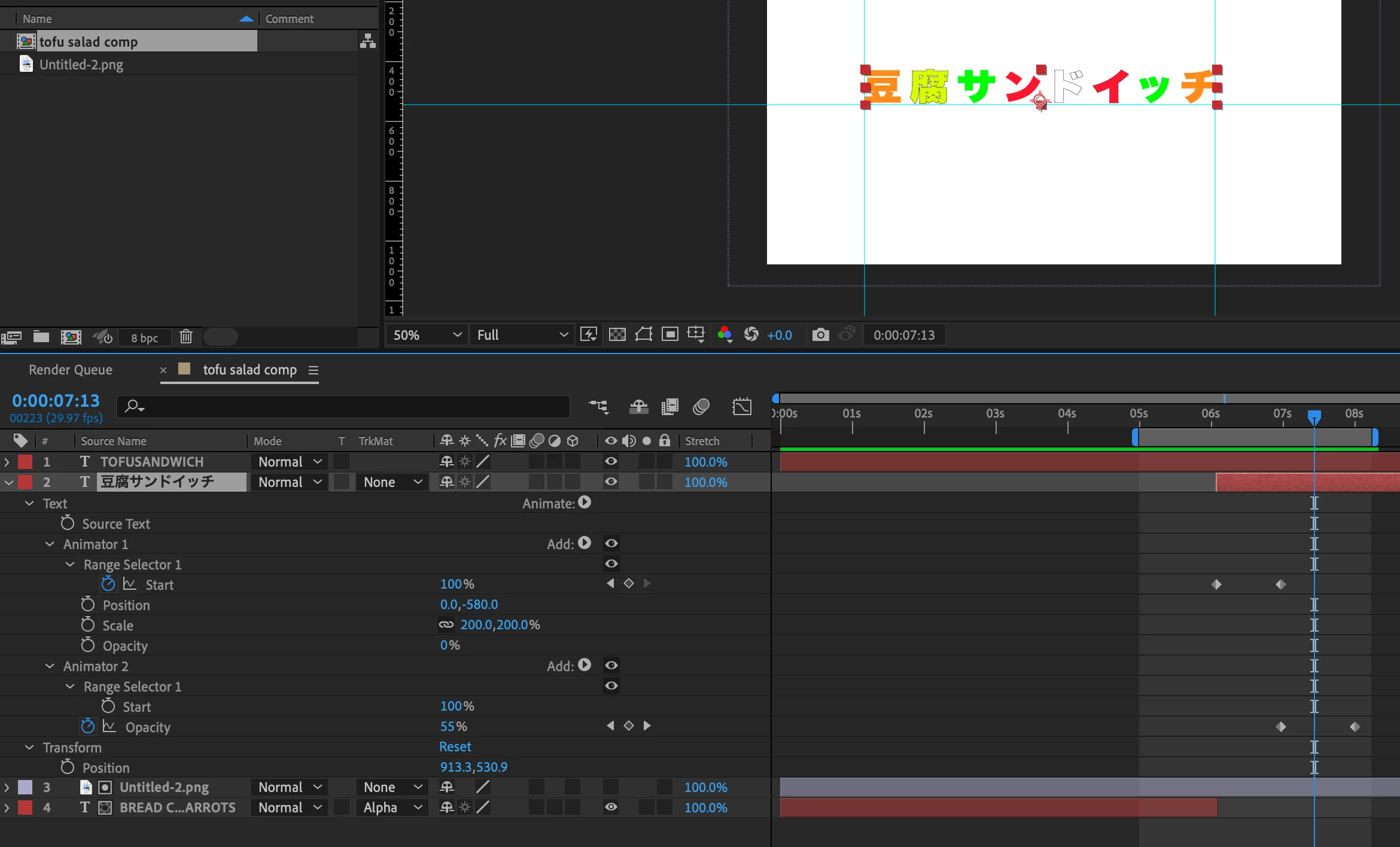 1) Animator 1: Position (off screen), Opacity Zero; Start 0 - 100.