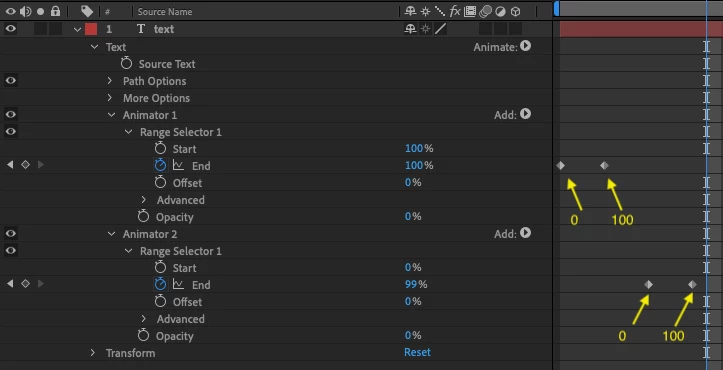 Animator 2's opacity never changes. I've done a variety of different combinations and the opacity number will change but the text will not animate and I can't figure out why. Can someone tell me what I'm doing wrong?