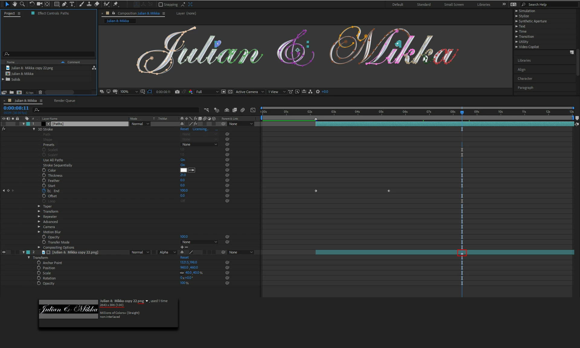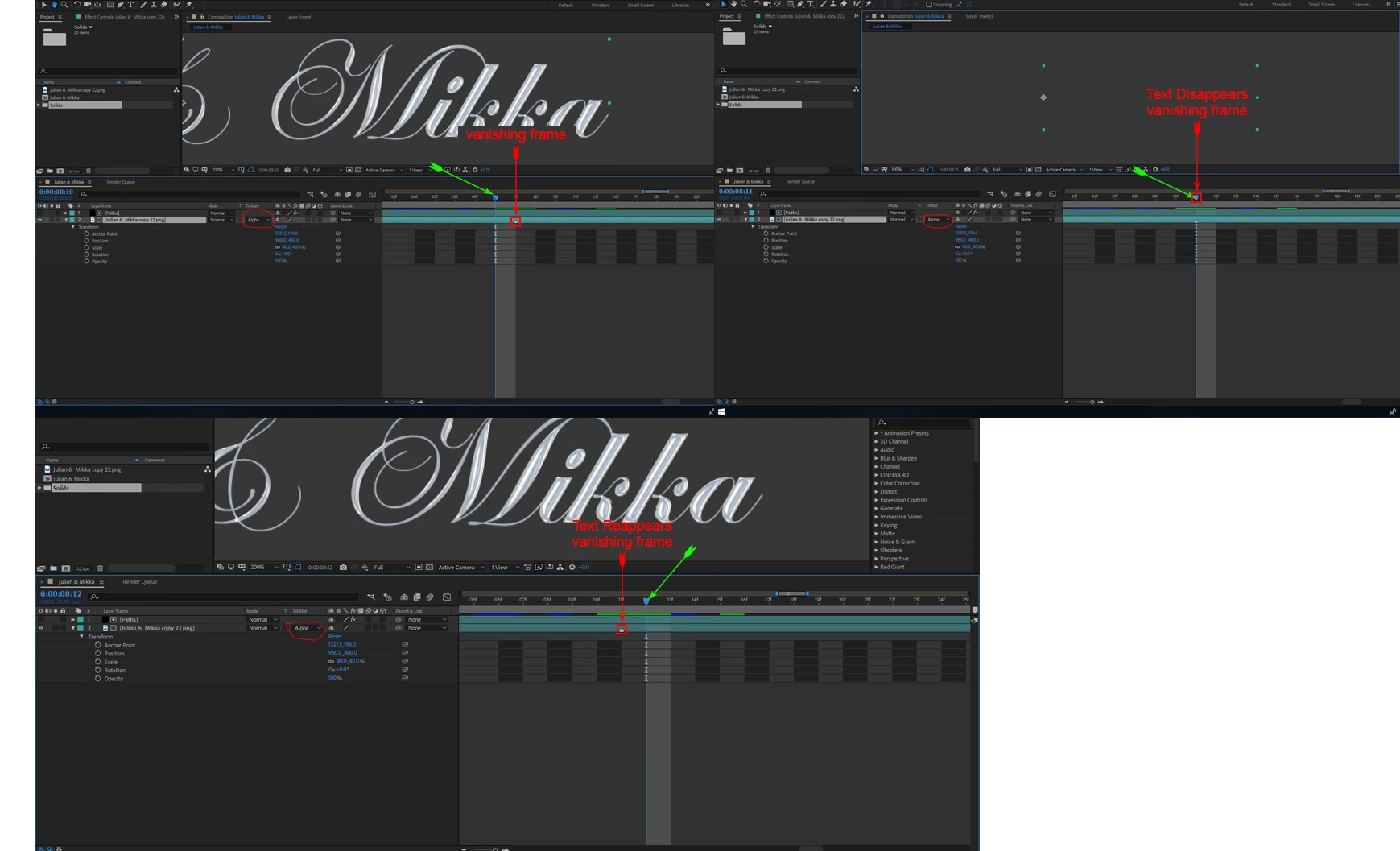 Your screenshots don't tell us much. The top layer is being used as an alpha track matte for the bottom layer, frame 10 and 12 seem to show the text layer, we can't see what is happening at frame 11. What are the modified properties of both layers? I can see that the bottom layer is a png file and it is scaled to 400% so it's probably pretty soft. You should never scale a stationary layer over about 120% unless it is a vector image like a shape layer, a text layer or an Illustrator file. The anchor point tells me that the PNG is probably 1920 wide and 920 high so it is not the same size as the comp. The position property could mean anything because 1321.5 for X and 192 put it outside and above a standard HD comp and barely inside and at the top of a 4K comp. I assume that the top layer contains some kind of animated paths because it is being used as a track matte for the bottom layer. I also assume that you are using Trapode 3D stroke in the Paths layer because of the reference in the post. This is probably a pretty good assumption since the layer is not 3D, but we have absolutely no idea what you are trying to do.