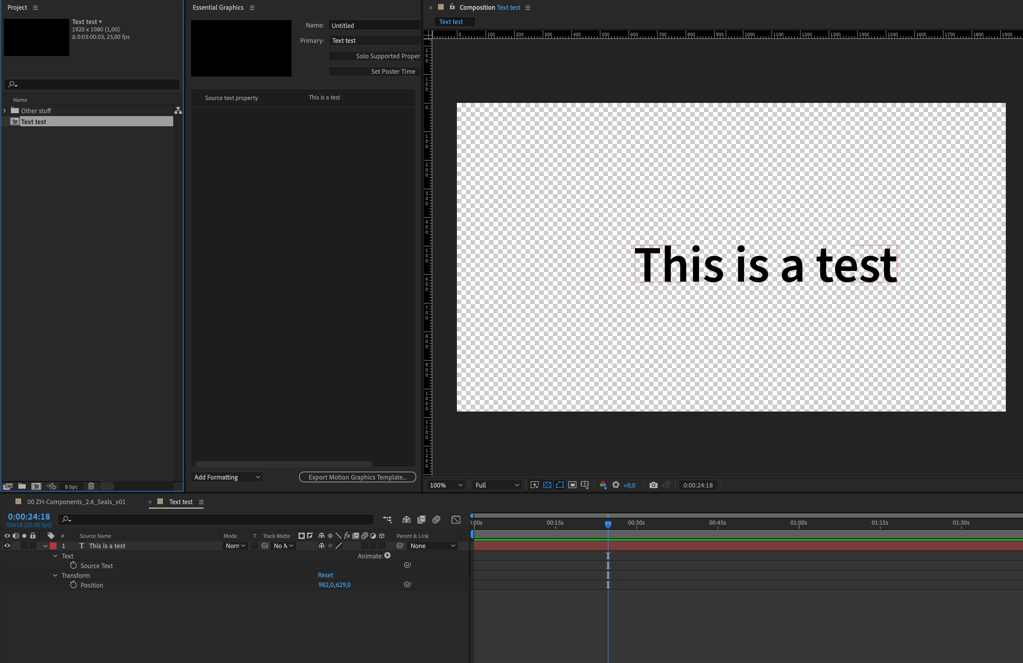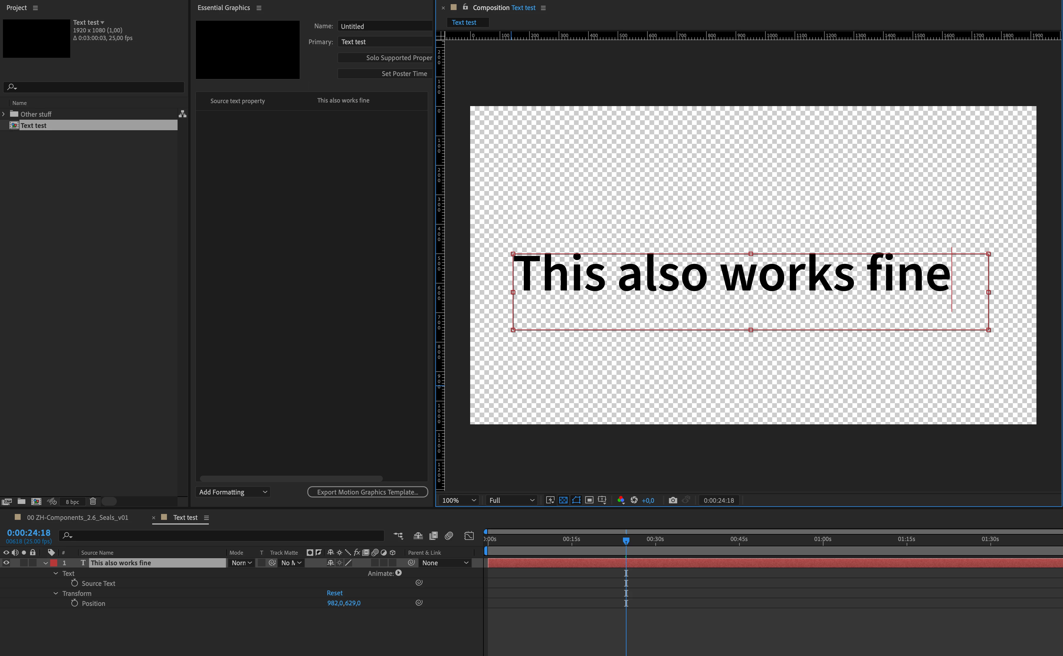 But if I want to edit the text via the Essential Properties panel, and push to primary comp, I get the following error "After effects error: internal verification error (unexpected match name searched for in group (29 :: 0)" and it deletes the text layer, and sometimes AE even crashes completely.
