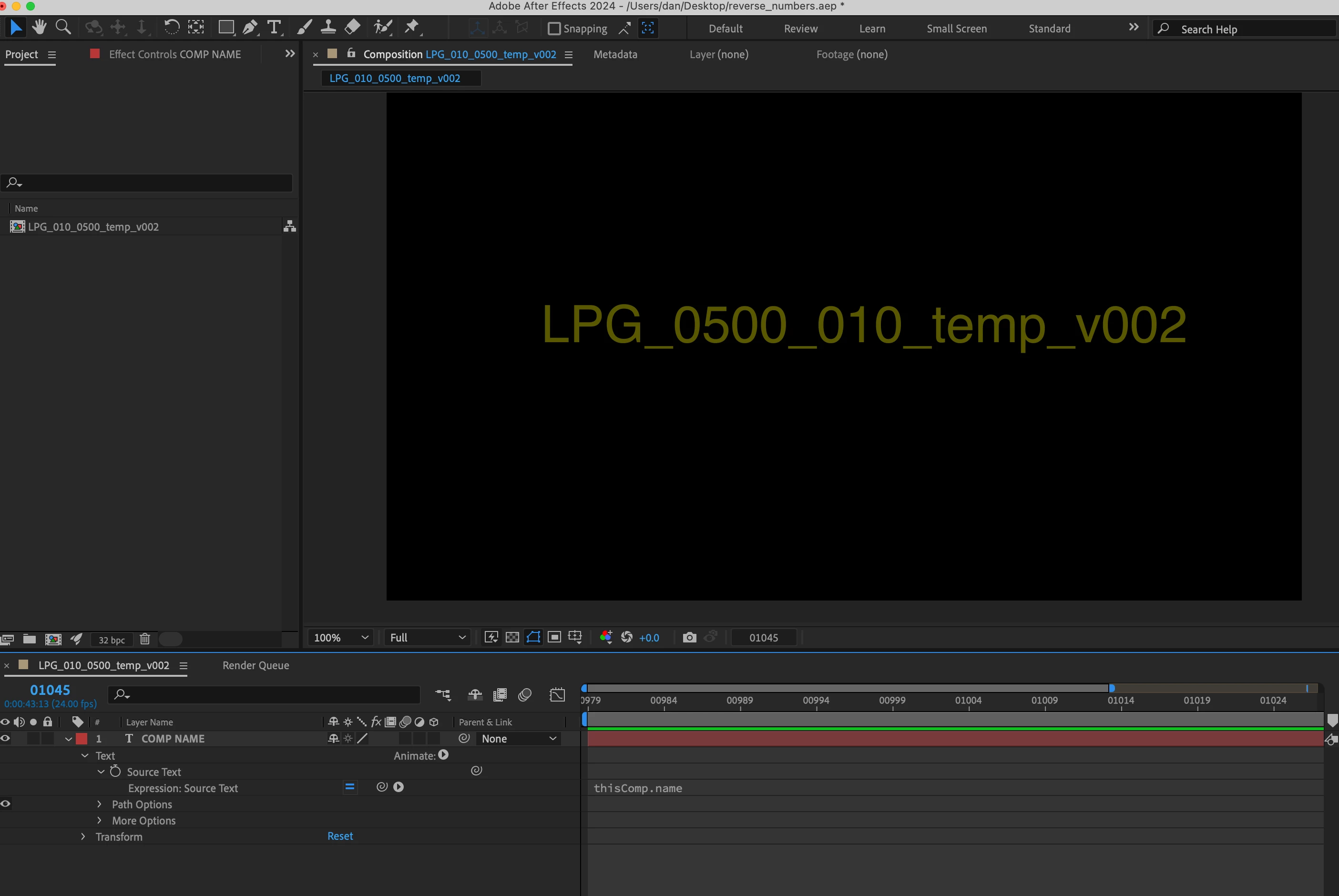 I am trying to use an expression to set a text layer to the name of the comp, but the text is somehow getting reversed. I am using this expression for the source text : thisComp.name - but when it appears in the comp, some of the characters are swapped around. See attatched where the yellow text is the dynamic live text generated from the white comp name below. But notice how the yellow text has swapped the "010" and "0500". Maddening....