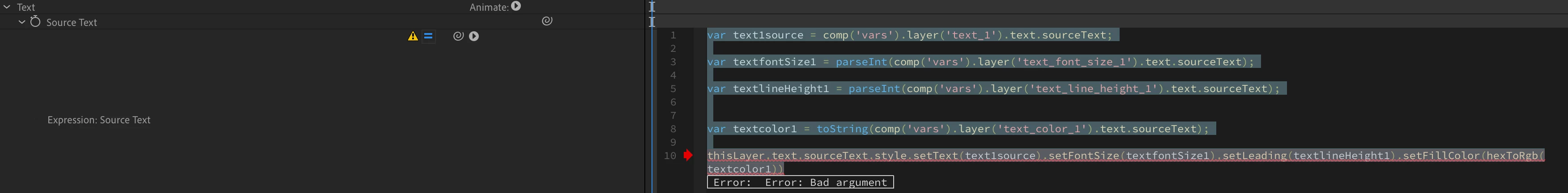 var textcolor1 = toString(comp('vars').layer('text_color_1').text.sourceText); thisLayer.text.sourceText.style.setText(text1source).setFontSize(textfontSize1).setLeading(textlineHeight1).setFillColor(hexToRgb(textcolor1))