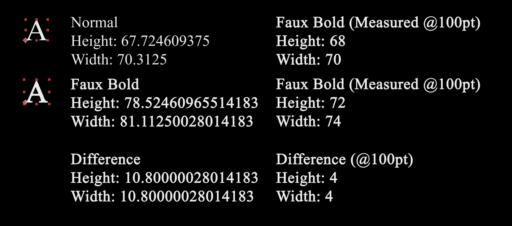 After investigating I discovered that at 100pt, faux bold always ads 10.8 ... px to the initial bounding box.