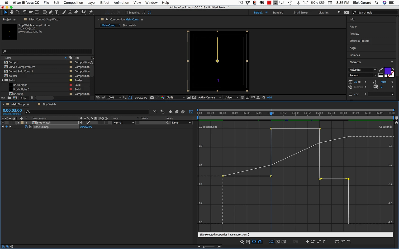 Nest the stopwatch comp in a regular comp and apply time remapping. You'll get a keyframe that starts the stopwatch, then it runs for the time of the comp, then after the end of the comp, you get another keyframe. The first thing to do is to add a keyframe at the last frame and delete the last keyframe. The stopwatch will now run in real time. You want the stopwatch to slowly start and be up to full speed with it gets to 1 second, then you want it to run in real time until it gets to 3 seconds, then you want it to slow down and stop at 3.564 seconds. The first thing to do is to move the CTI to the 1-second mark and set a new keyframe there. Then move the CTI to the 3-second mark and set another keyframe, then you move the CTI as close as you can to the 3.564 mark and set another keyframe there. The last step is to delete the last keyframe.