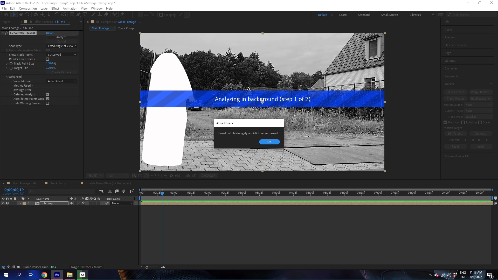 Facing this issue for 2 days now, whenever I try to use the 3d Camera Tracker or Warp Stabilizer after analyzing for sometime it shows me the error "timedout obtaining dynamiclink server project." I am not even using the dynamic link its a simple video import that I precomposed and now trying to track it.